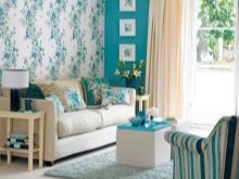 - "Cold" colors and shades (blue, blue, turquoise, purple) will add to the decor notes of freshness and lightness. Such a pattern will expressively blend in with the furniture in white color.In the living room with such decor it will be especially pleasant to be in the hot season.