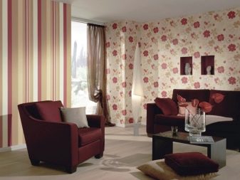 Striped wallpaper combines harmoniously with buds. This option creates dynamics and expressiveness in the interior. It is great for decorating corridors and hallways and living rooms. Together with the cage, colorful wallpapers also look stylish. Contrast is used here: soft, flowing lines of a floral ornament and strict, laconic geometric figures.