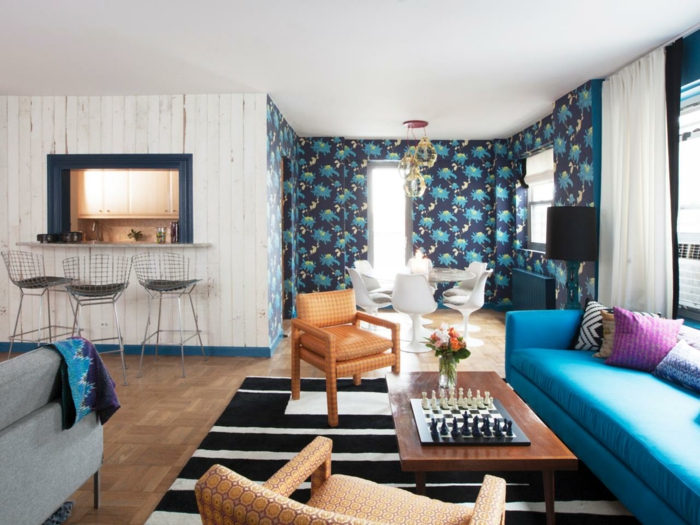 Advice from designers: furniture and other decorative elements in neutral and bright colors are chosen for wallpapers with colorful and bright patterns. If the pattern is neat, in delicate colors, you can make a choice in favor of more expressive and colorful pieces of furniture.