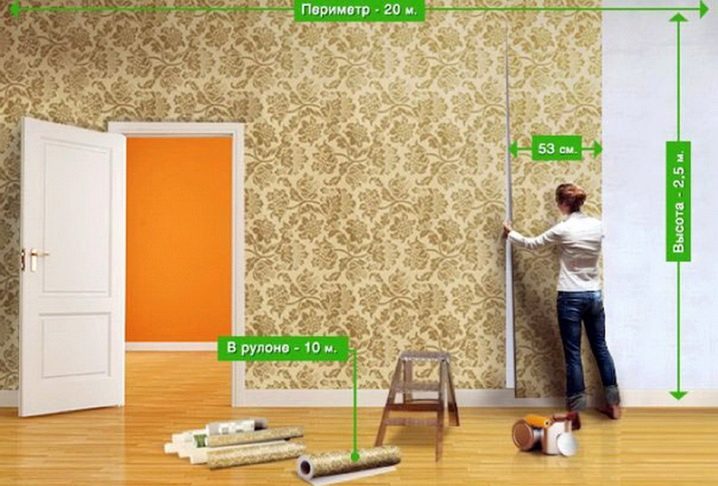 For example, in a room with a ceiling height of 2.5 m, 4 panels will be released from a roll of wallpaper without a pattern of 0.53x10.05 m.0.53x4 = 2.12 m. Therefore, one roll will be enough to glue wallpaper about 2 m around the perimeter of the wall. To count the required number of rolls, the perimeter of the room (windows and doors are not taken into account) is divided by 2.12 meters. An additional roll is needed for pasting the surface above the windows and doors, as well as under the windows. If the ceilings are high, there will be no need to buy another roll for the space near the windows, as there will be enough residues for pasting.