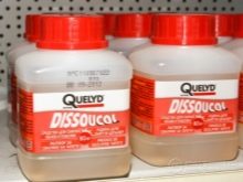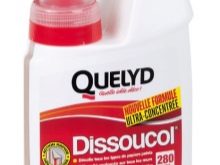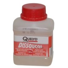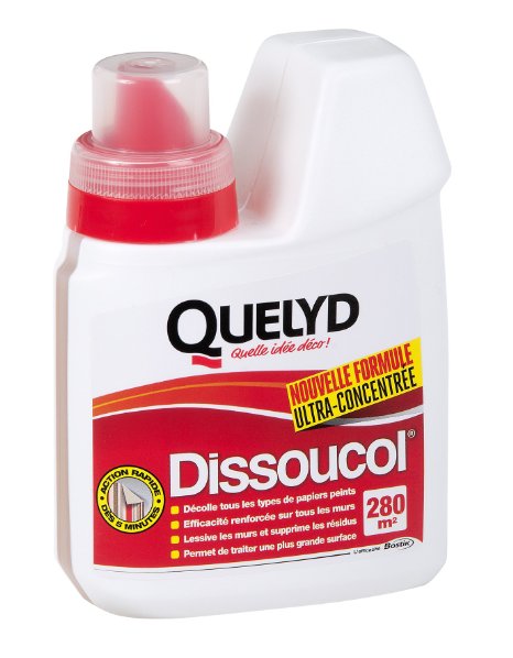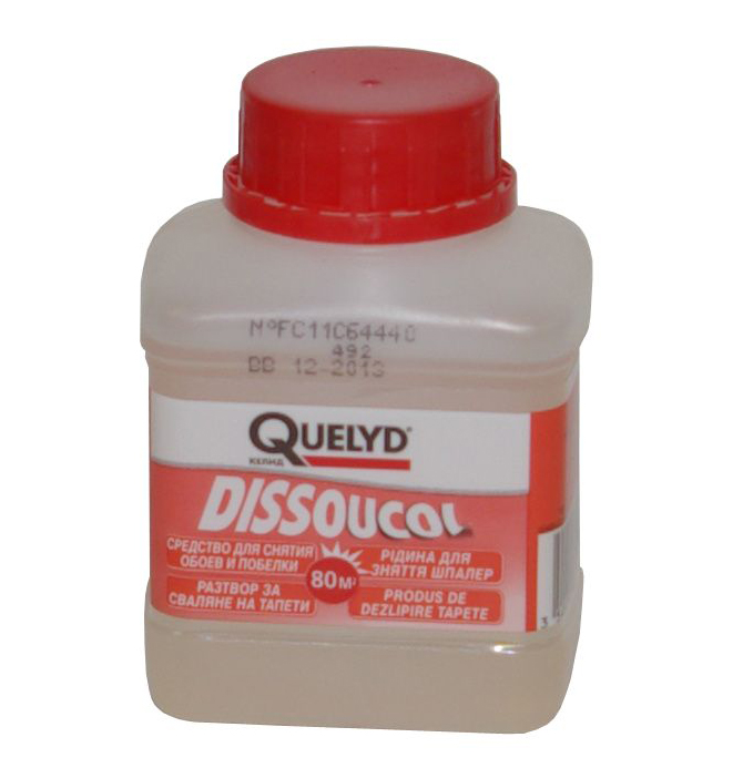 - Quelyd wallpaper remover Dissoucol - A more expensive option, its price is about 400 rubles. Manufacturing country France. It is suitable for thin and vinyl coatings. Can also be used to remove whitewash. Based on the statements of the manufacturer, the composition is completely biodegradable and safe. You can use it in the presence of people without fear. The composition is quite economical. One bottle is enough for surface treatment from 50 to 100 square meters. m