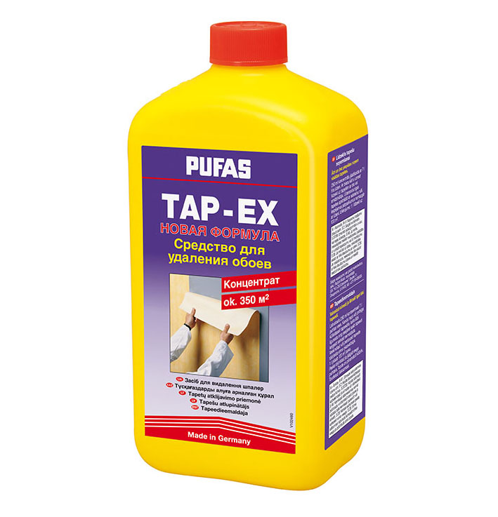 - Wallpaper Remover Pufas "Tapex" 250 ml at a price of about 180 rubles copes with any type of wallpaper. You can remove them with the help of this composition both from the walls and from the ceilings. It is produced in a concentrated form and requires dilution with water. For breeding the entire bottle and for processing areas of 75 to 100 square meters. m will require 12 liters of water. The product is environmentally friendly and does not have a strong odor. Manufacturing country Germany.