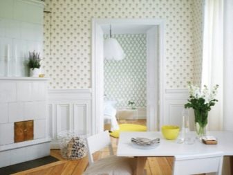 White vinyl wallpaper, which is perfectly amenable to wet cleaning (up to the use of a not too powerful washing vacuum cleaner) will be an excellent option to paste over the entire kitchen space. In this case, you should not worry about the allocation of "kitchen apron" in any less easily soiled and catchy color. Thanks to unpretentiousness and wear resistance even with regular cleaning white wallpaper will last a long timewithout losing its pristine purity: it is important only to clean up pollution in time.