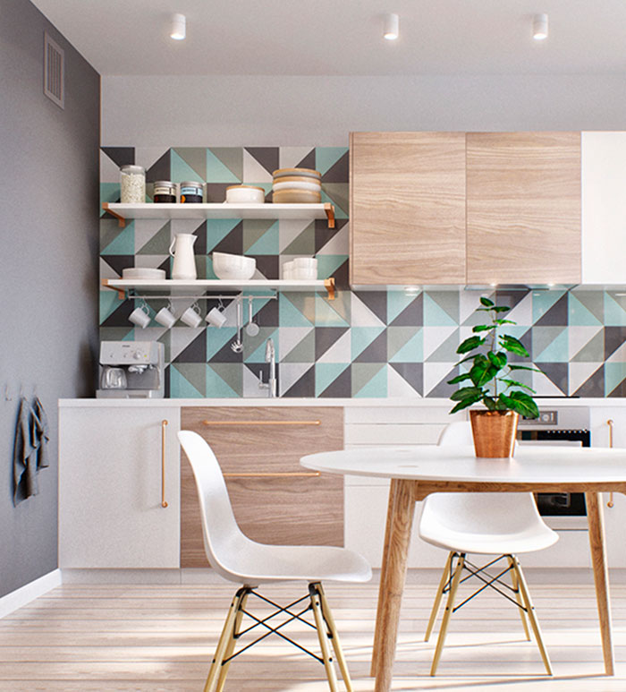 Geometrical figures in the working area will effectively hide not only possible defects of the walls, but also mask the indelible stains that may appear during cooking or other actions.