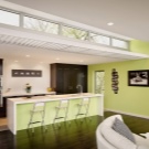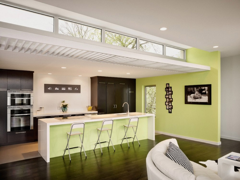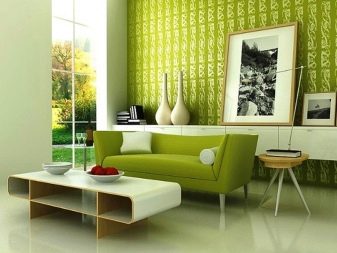 A white sofa and a small strict table will emphasize the simplicity and airiness of the interior in the style of minimalism with bright green walls, light ceiling and floor.This choice of finish will avoid the feeling of heaviness and coldness in space, but it does not make it huge and empty.