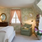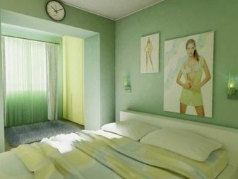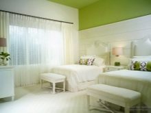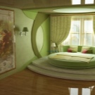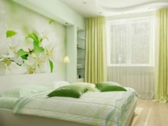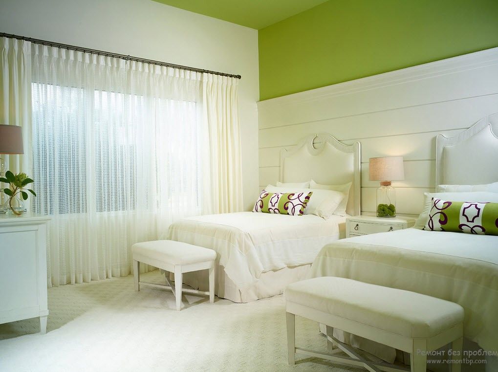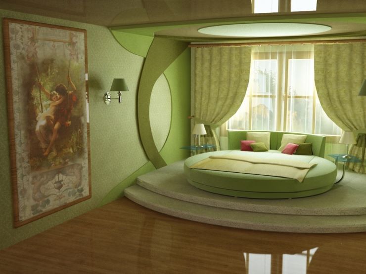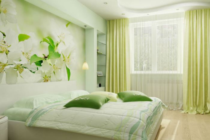 In the bedroom green is available for any style. Delicate shades with small flowers, twisted furniture, soft pillows and lace will perfectly fit into the style of Provence. Gamma of light colors is the easiest to fit into the interior in order to create comfort and anti-stress effect.
