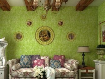 Country style decor with all sorts of cages, peas, light trimming under aged wood will refresh lime wallpaper with an unobtrusive structure.