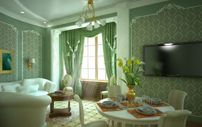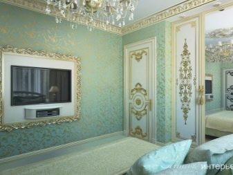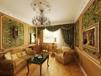 Green with gold is also a fairly common combination. Golden wallpaper designs, furniture, curtains add luxury and palace style to the decor. Green is one of the royal colors.