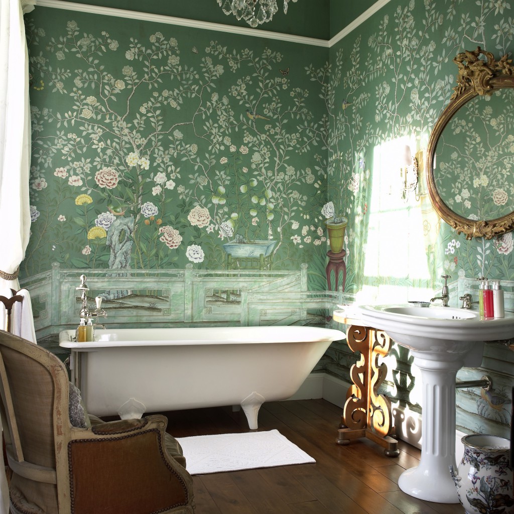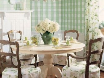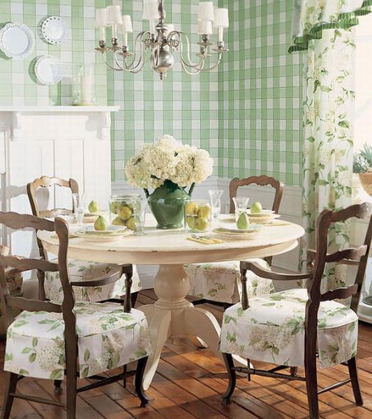 Rustic motifs and the provincial style will be tinged with pale green wallpapers with cute pink roses. Rich furnishings and expensive furniture in a country house will be supplemented with monogram or golden stripes. Large space can allow it.