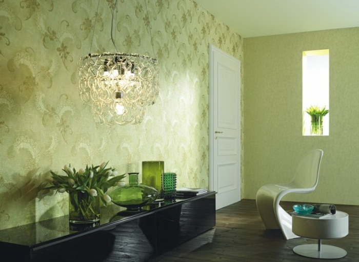 Beige wallpaper will complement the light green color. This combination is appropriate in any room. A fresh and at the same time calm design in your living room, kitchen or bedroom will add a different mood if you add various accessories.