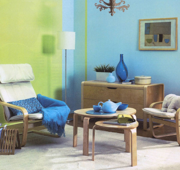 White-green combinations look especially impressive. The interior will be both light, fresh and stylish. Yellow-green walls will add to the room a sunny color, lightness, joy and spring mood. But it is better not to use both colors in bright colors. In this case it is necessary to dilute them, for example, with white and pale blue, in order to calm the situation. Blue-green interiors evoke thoughts about nature. Shades of grass, sky, sea, trees bring peace and tranquility.. This is a very good combination for a rest room.