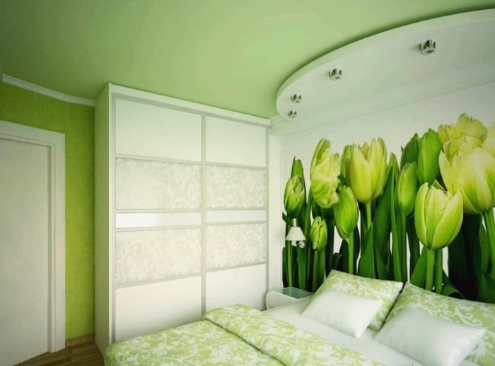 Lovers eclecticism will appreciate the design of the room in which the wall will be finished with a green coating with large circles. It is better to decorate the remaining walls with calm monophonic wallpaper. Photowall-paper with orchids will decorate green tones of the room and will make fashionable and fresh accent.