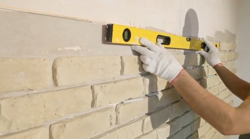 Laying tiles start at the bottom: the first panel is superimposed on the wall with the solution applied on it and pressed against it. Then wedges are placed under the panel and the level of its horizontal and vertical position is checked by level. If there are discrepancies, they are eliminated by tapping with a rubber hammer on the panel. After the first row is laid, the second row is assembled; it is mounted with an offset to give credibility to the brickwork.