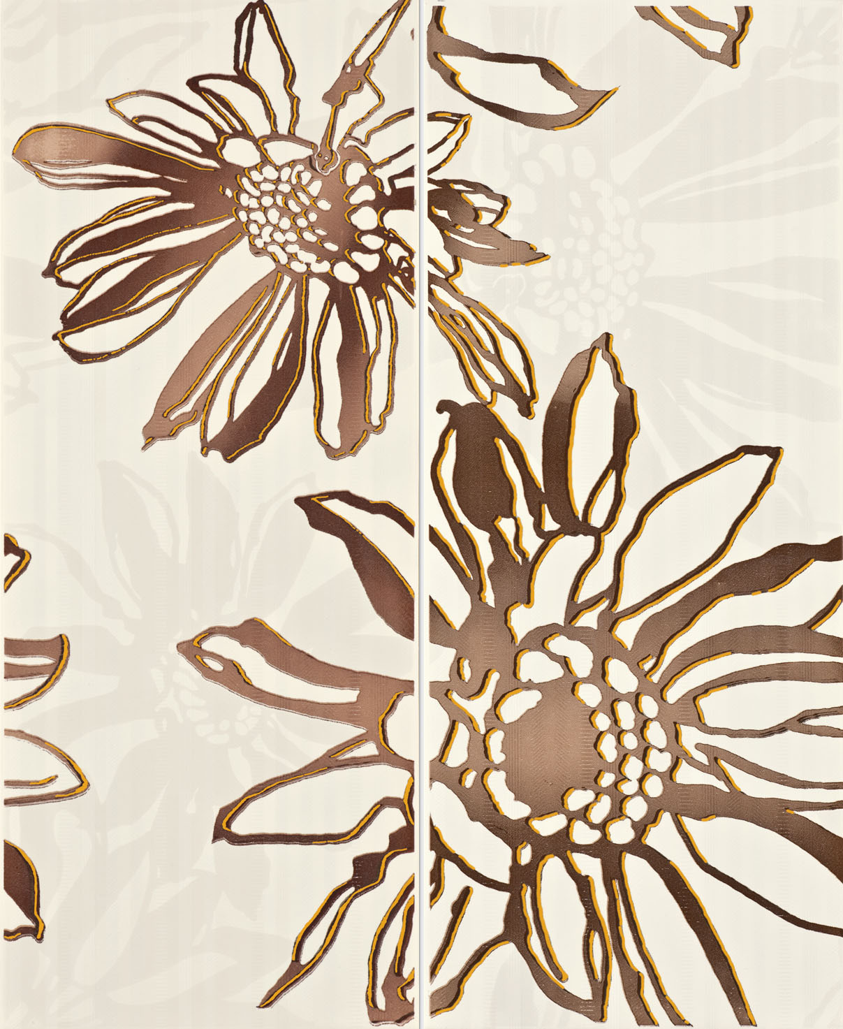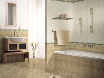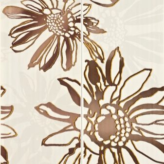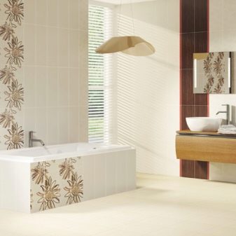 The tile is decorated with a striped pattern with the addition of floral patterns, glass borders. In this collection there are options for ready-made panels (drawing of two 50x35 cm tiles) and friezes (25x8 cm) for connoisseurs of designer finishes. The floor tiles are square with dimensions of 33.3x33.3 cm, for walls - rectangular 25x35 cm.