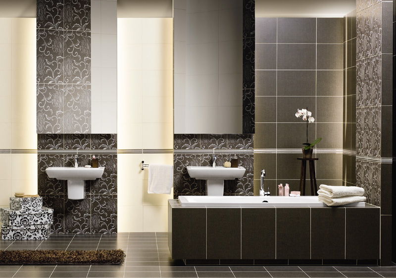 - "Verbena" - a collection of tiles in a simple style, executed in white, graphite and brown.Well suited for both bathrooms and rooms with formal furnishings, such as offices. The coating is decorated with a pattern of natural themes, which, combined with the color performance, creates an autumn atmosphere. The collection contains friezes (50x5.3 cm), which can be used to demarcate a certain area, at the same time creating a contrast for the main ornamental cover. The floor tile is square with an edge of 33.3 cm, the wall products are rectangular with the size of the sides 33.3 x 50 cm.
