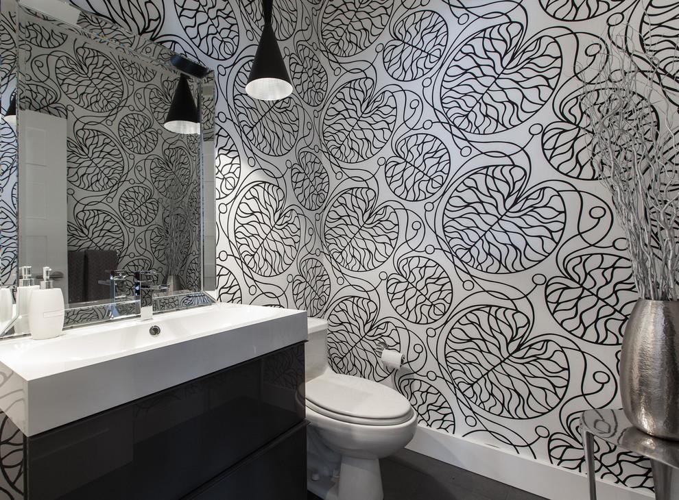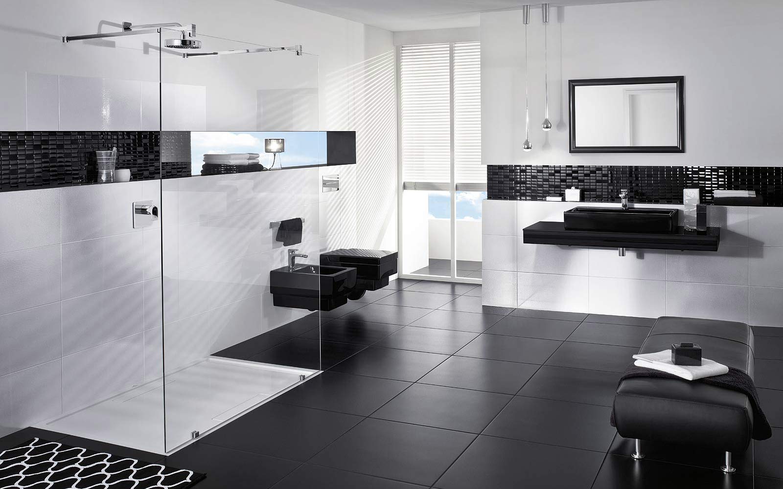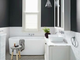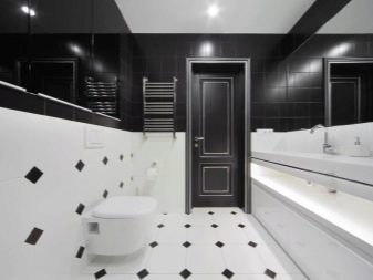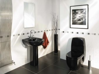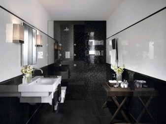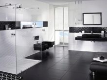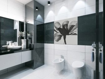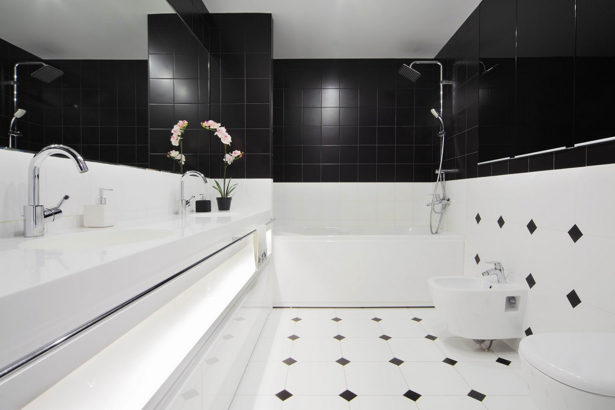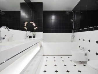 The use of black and white material in the bathroom allows you to make the room elegant and original. For bathrooms that are small in size, white glossy veneer with small black accents is suitable. Light finish will visually expand the space. More dark blotches are permissible only in spacious rooms.