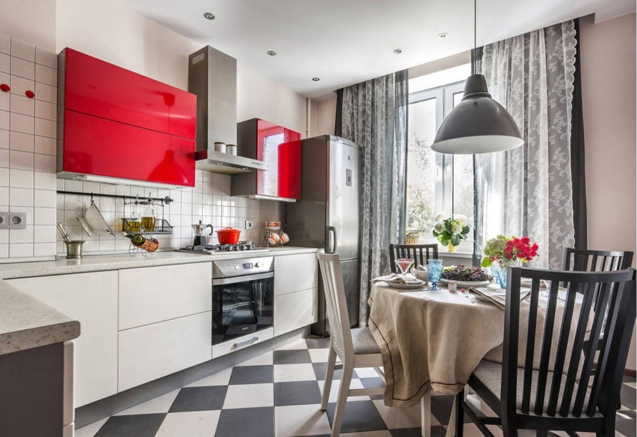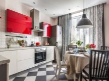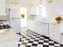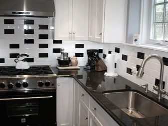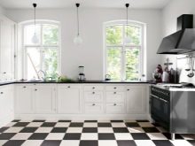 The most often contrast tile is used for decoration of an apron. Suitable black and white and for flooring. In this case, the elements must be large. If the kitchen set is made in bright colors, it is better to lay tiles on the floor in a checkerboard pattern.