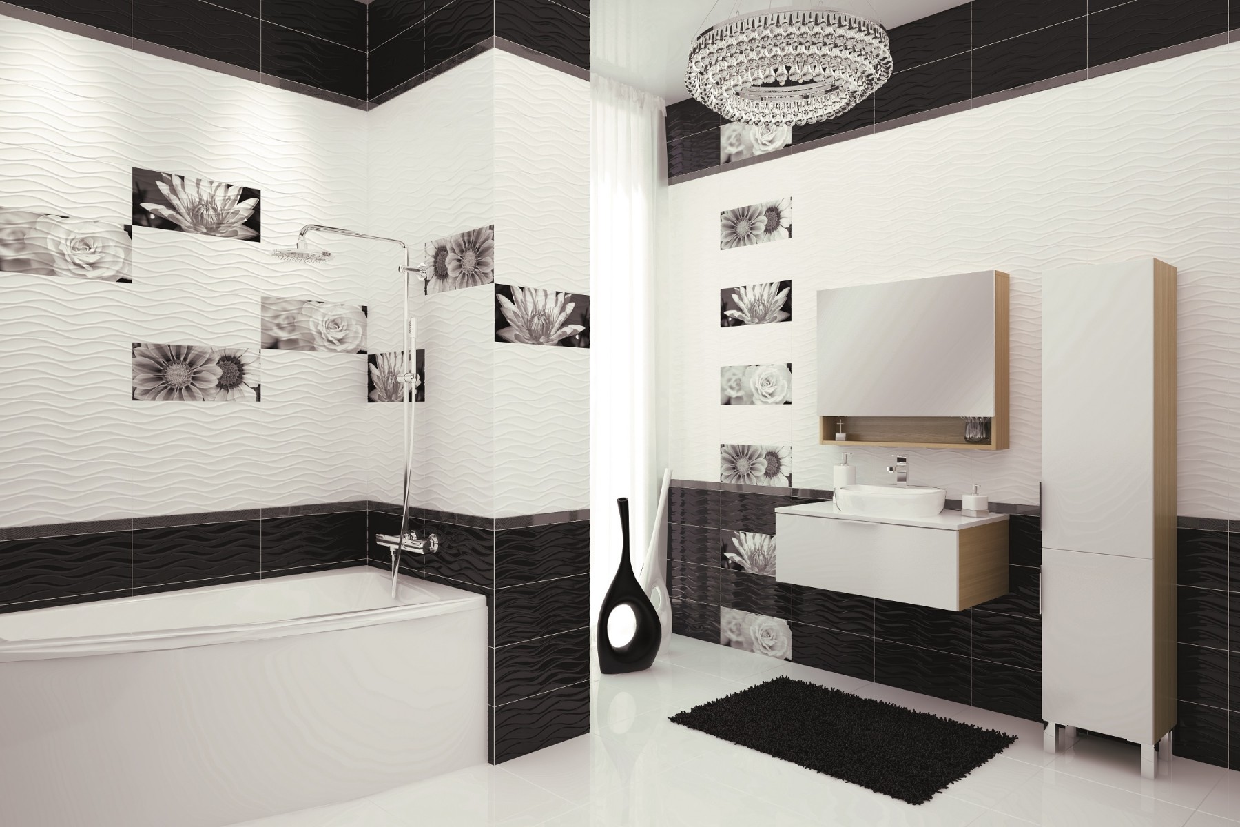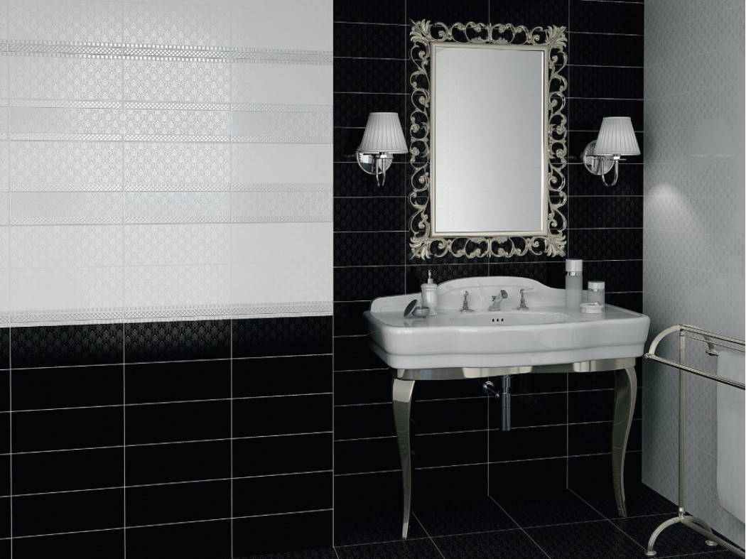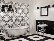 Design ideas using diachrome tiles are endless. So the walls can be decorated in black and white in the ratio of 3: 1. The surface opposite the entrance to the bathroom can be decorated with waterproof stickers or tiles with ornate patterns. The bathroom will be refined with white tiles with dark floral or floral patterns. Designers recommend using silver-gray or black colors for borders.