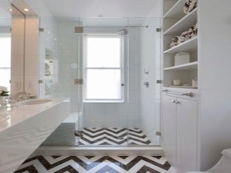 In order to fill the lack of space and to hide the flaws of the layout, you can use the Christmas tree shape. If the white color of the tile is replaced with a milky shade, the contrast of the coating will not be so sharp. The room, lined with black and cream tiles will look more tender. If a tile in a room is intended as a coating for both walls and floor, it is necessary to distinguish these surfaces with the help of different patterns or textures. For example, the floor can be laid out with rhombuses, and on the walls to imitate brickwork.