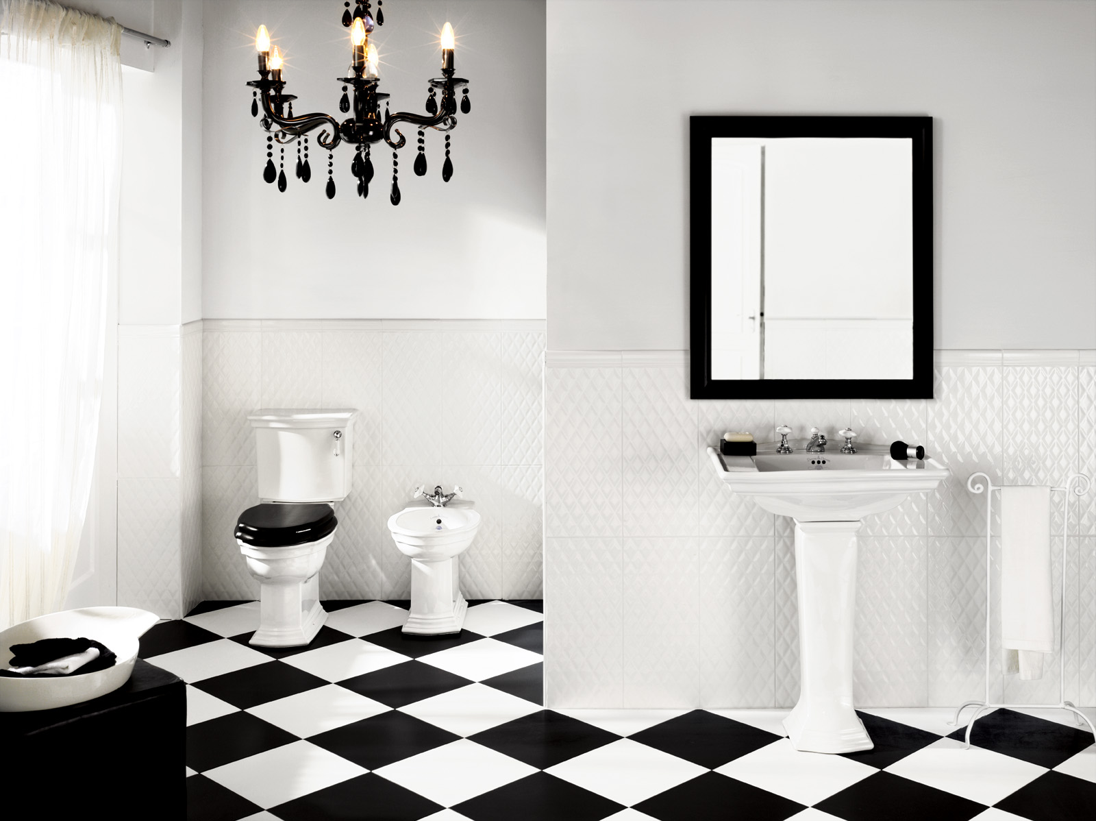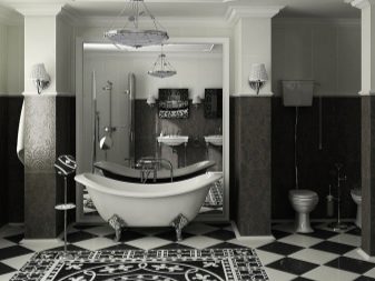 A small black and white bathroom especially needs good lighting. It can be spotlights around the perimeter. In such a room would be appropriate and a white chandelier of geometric shape, decorated with crystal or chrome elements. Golden elements are also permissible.