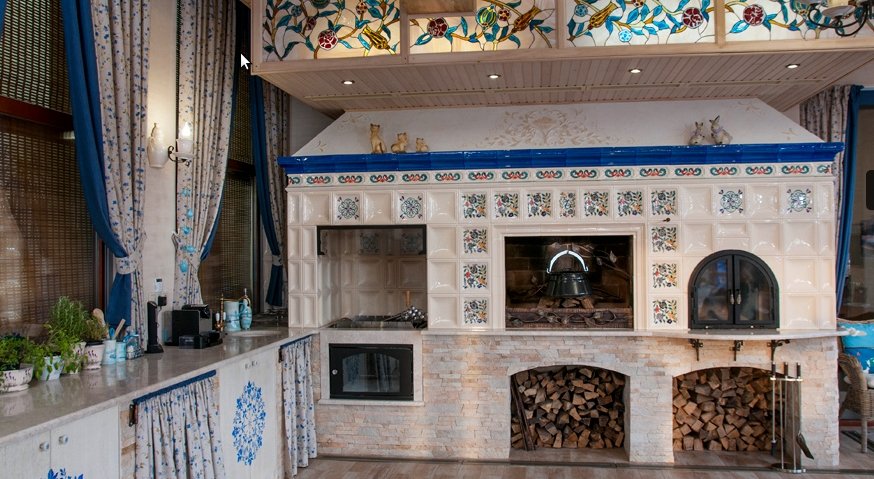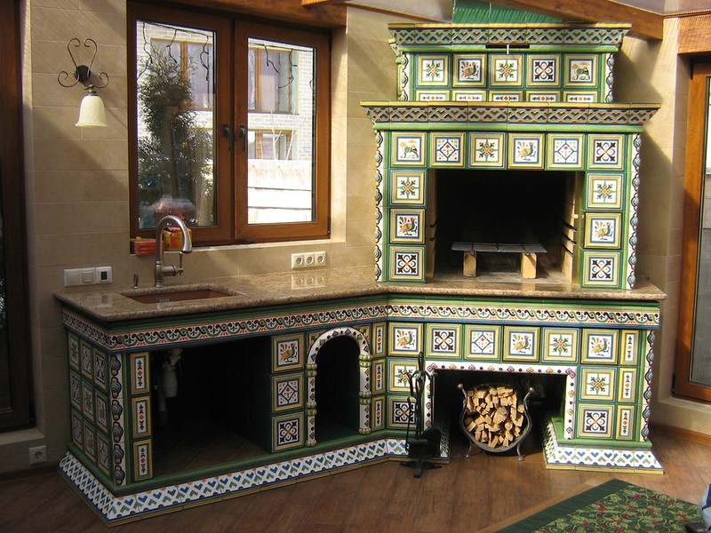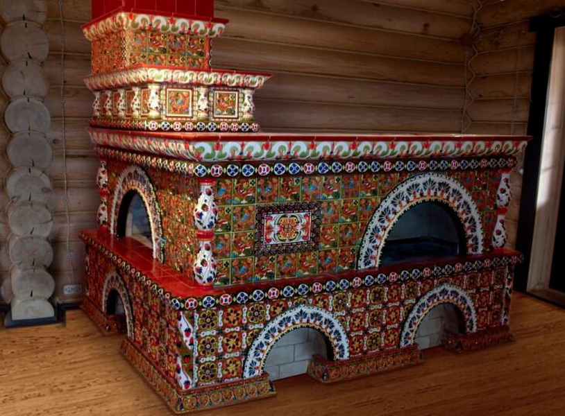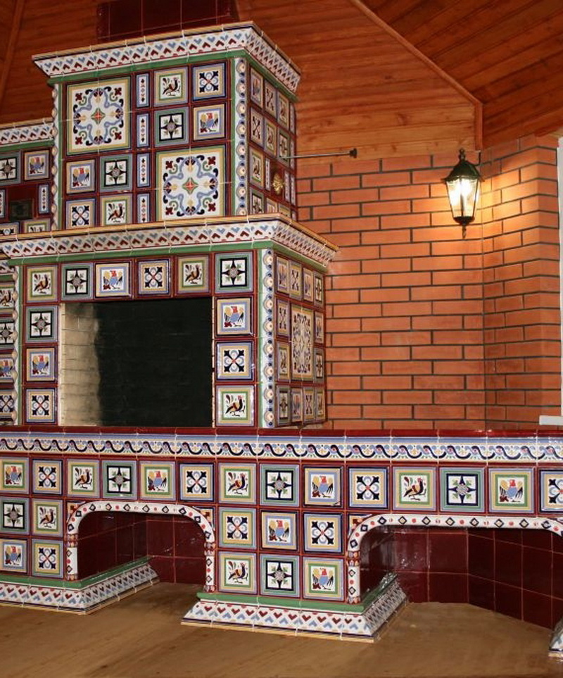 The fireplace will occupy a central place and attract attention to itself, which is why its decoration is always performed in bright colors, very often adhering to the design of ethnic trends. For example, the traditional Russian stove has always occupied a central place in the house, it was called "Mother" and decorated in accordance with the traditions and functional features.