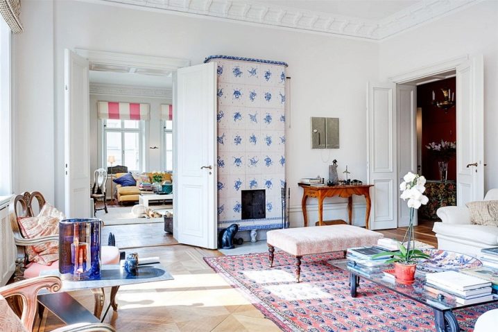 The most common way to use ceramics in interior design, apart from dishes, is to cladding various heating devices - fireplaces or stoves. In the era of centralized and gas heating of apartments and houses, the need for furnaces for heating residential premises has decreased, but such alternative heating devices do not lose their relevance, being a colorful and useful object in the interior of residential premises.
