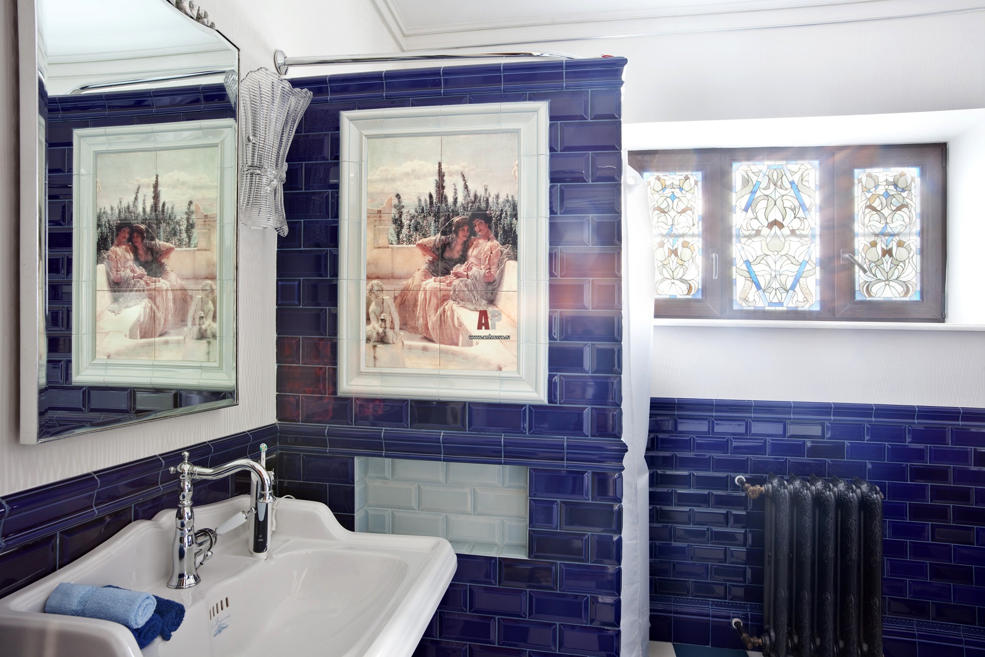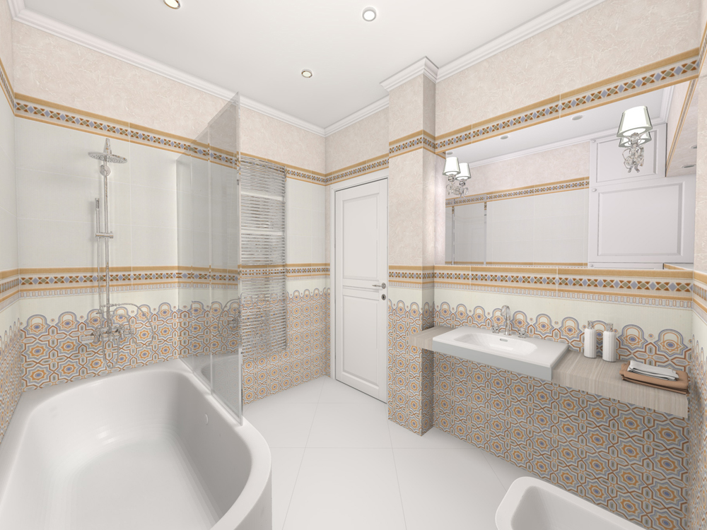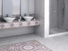 Tile designers suggest including decorative floor and wall panels. They can be made on any subject: landscape, still life, or personify any plot, while being smooth or embossed. It should be borne in mind that decorative panels are much more expensive than the main part of the coating.