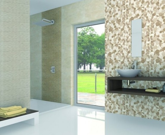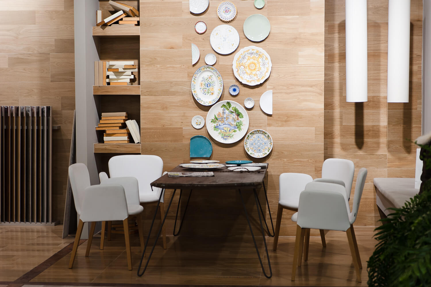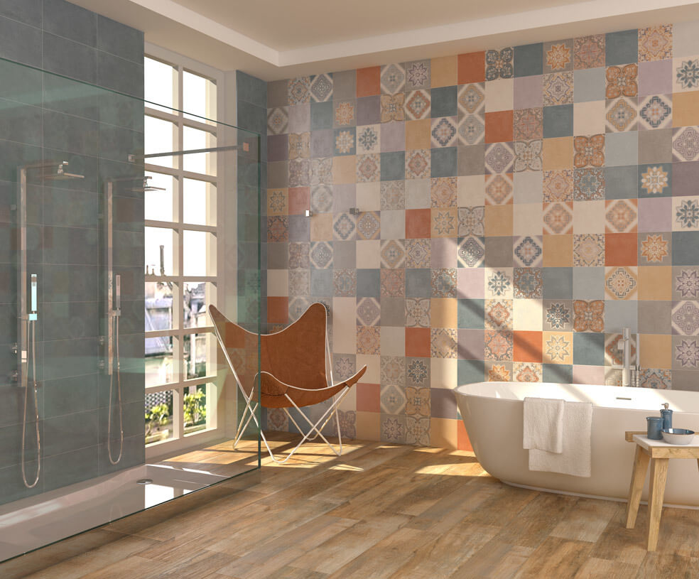 In some collections there is a symbiosis of tiles and porcelain tiles to create a complete interior.