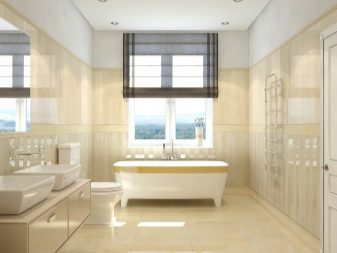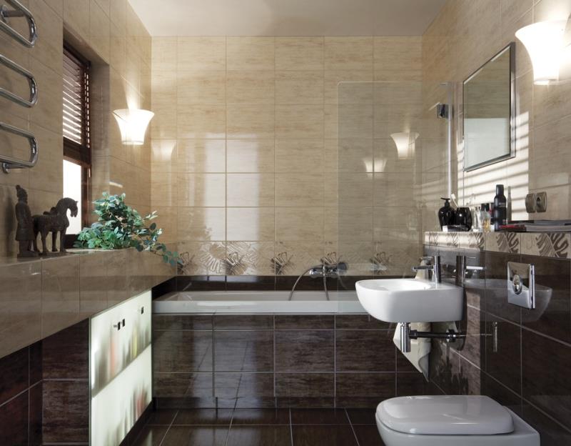 Glossy tile reflects light and creates a feeling of sparkling purity. Special panelsoffered by building stores in a large assortment, can turn a bathroom into a corner of the underwater world, a sea beach, forest grove or a tropical garden. On the walls, you can create any patterns, combine with all sorts of different shades. Although for rest and relaxation it is preferable to cover delicate tones, for example, pale pink or light turquoise.