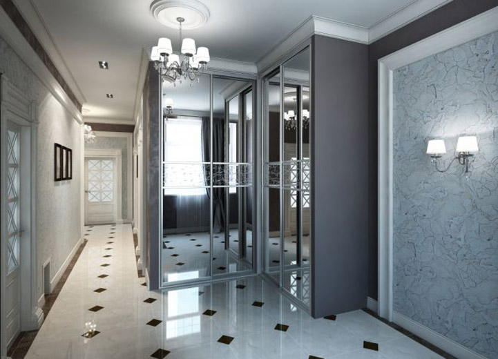Shining walls and floor can be found in the corridor. Where there is little lighting, gloss is particularly appropriate. And with the included artificial light, he is able to create a real festive atmosphere. Here, glossy tiles can be combined with other surfaces. For example, if the walls are decorated with white tiles, you can lay a dark laminate on the floor. If the walls are covered with wallpaper with a pattern, then a monochromatic large-format tile will be appropriate on the floor.