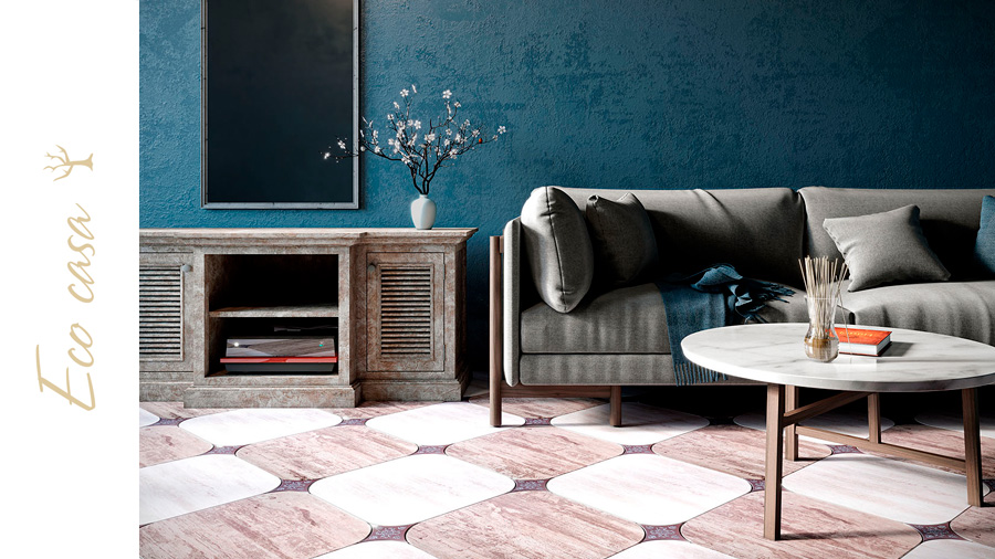 - Tile format Eco Casa suitable for lovers of natural materials in the interior. This is a godsend for those who are tired of city dust and are looking for peace in the lap of nature. The main colors are warm shades of brown with a variety of floral and other floral ornaments.