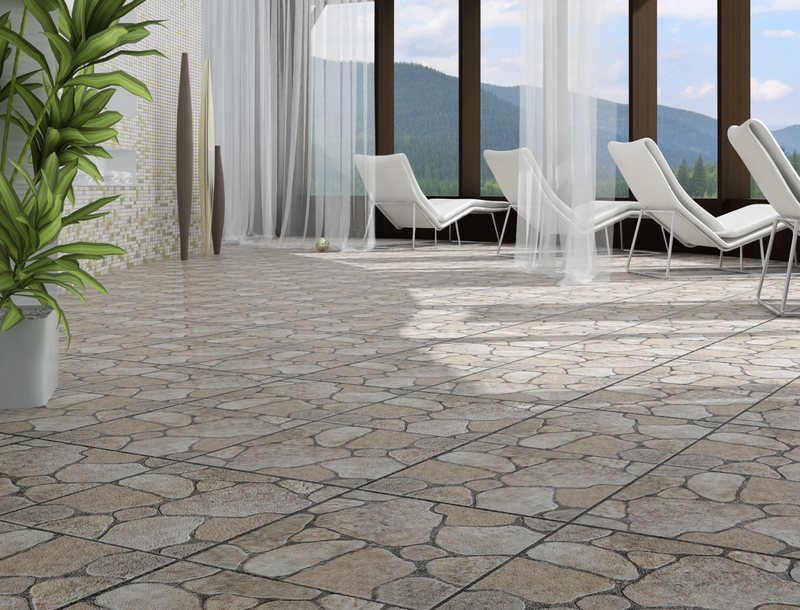Tile Tuluza - a spectacular mix of different textures (stone, wood and metal), decorated with ornaments. Instances Patiento remind paved pavers Spanish courtyard, with the texture of gray or beige stone.This version of porcelain tile with a matte surface has a high frost resistance.