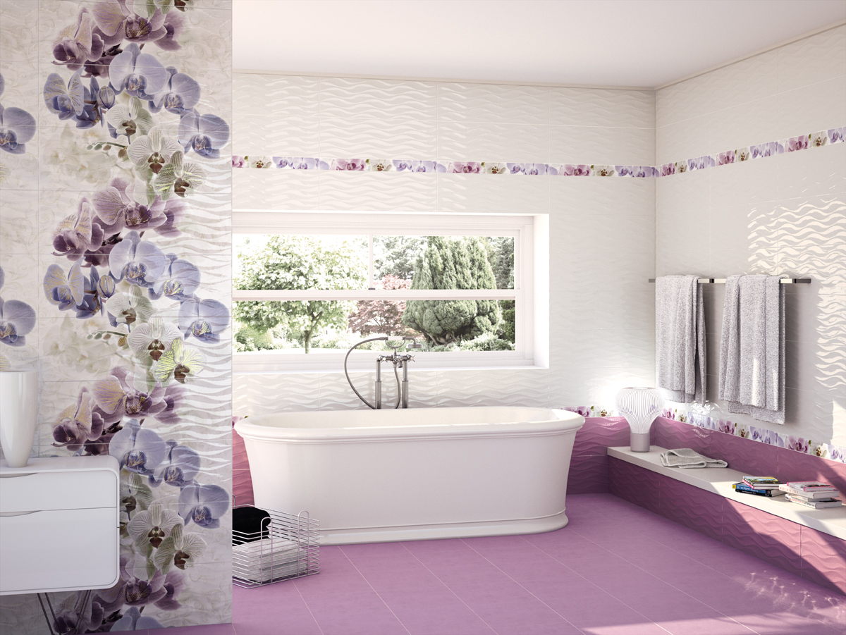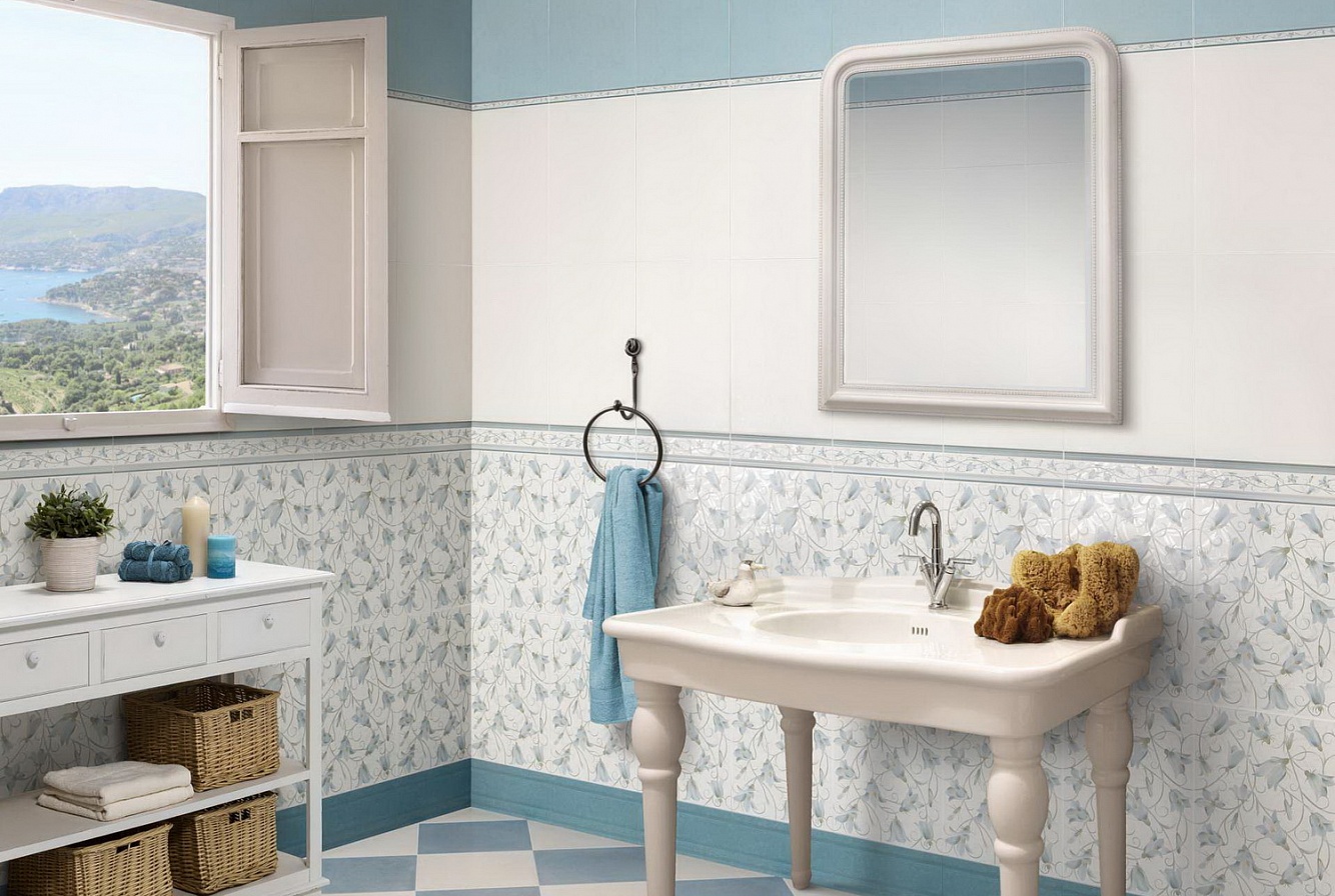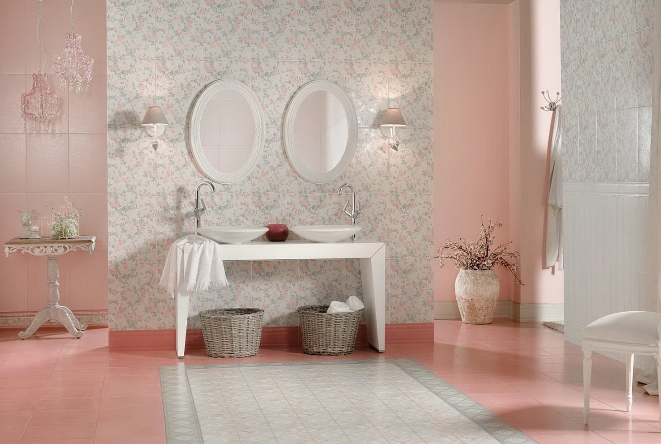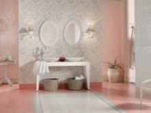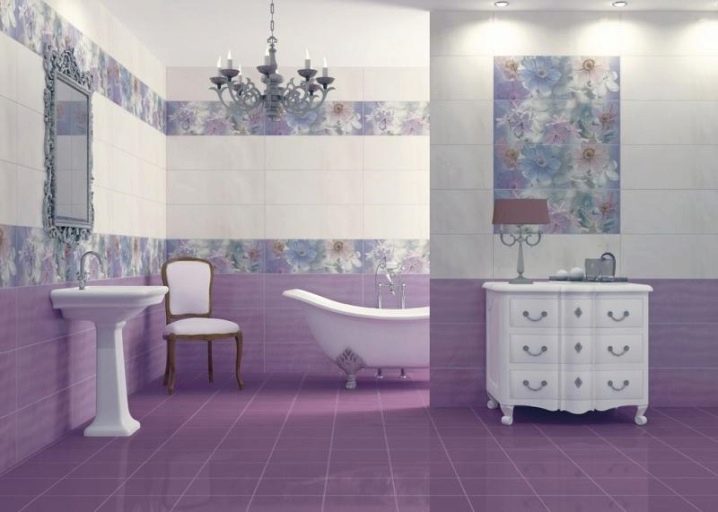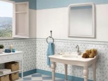 Light purple, peach, light blue - ideal colors for the eternal Provence style. And in the case of combination with tiles of milk-colored or ivory, the bathroom will become a very cozy corner of your home. You can use a few inserts with a delicate pattern or floral decoration.