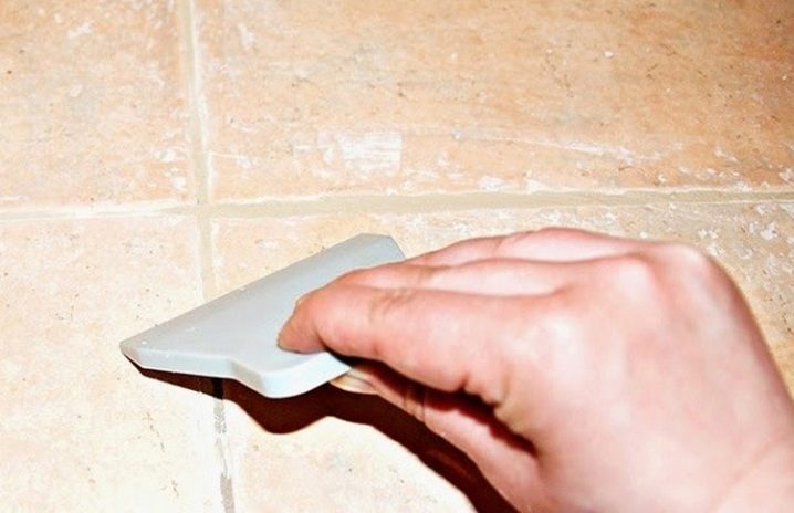 If the material has not dried up, it can be easily removed using a handy trowel. Then the tile is washed with water. With a dried spot is more difficult. It will be necessary to soften it using a special tool, and then clean it off using sandpaper. Some prefer to do this with the help of a grinder; however, such a tool should be used with the utmost care.otherwise you can ruin the tile.