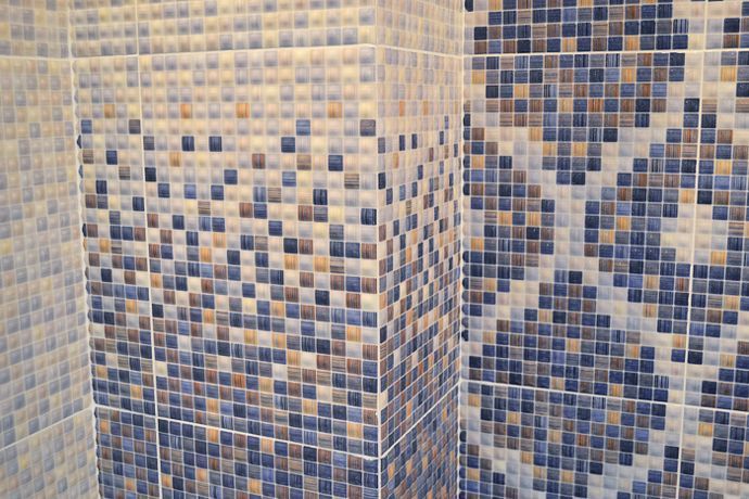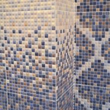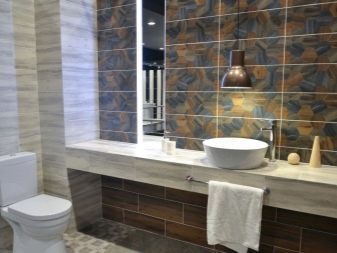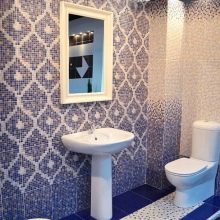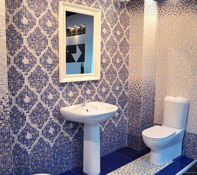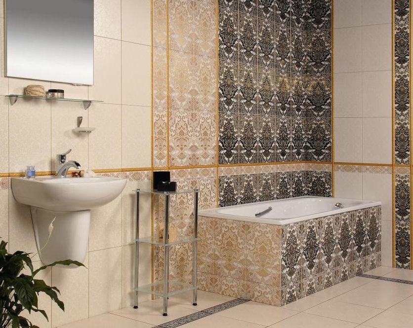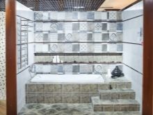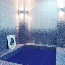 Despite the abundance of brilliance, the colors are pretty calm. Still, the decoration in the bathroom should have both relaxation and relaxation. The structure of the picture is a small mosaic. Several shades of one tone are beautifully combined with each other and create smooth transitions. Glazed ceramic eaves of 27.5 × 40 cm for walls and floor 40 × 40 cm are resistant to staining and cracking.