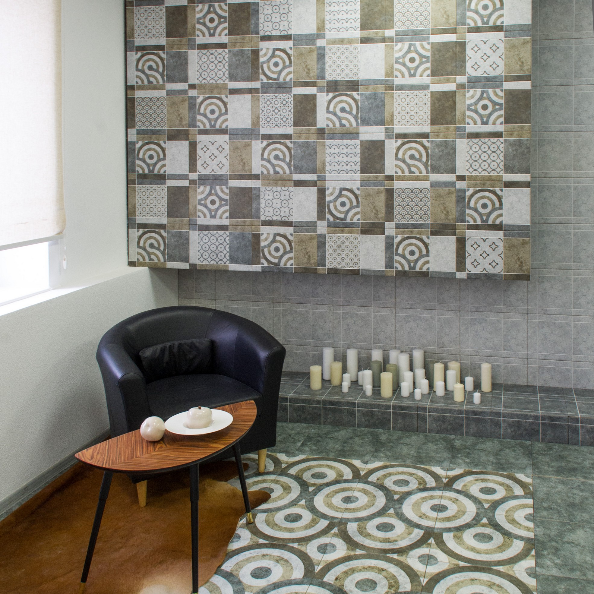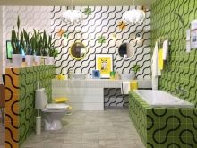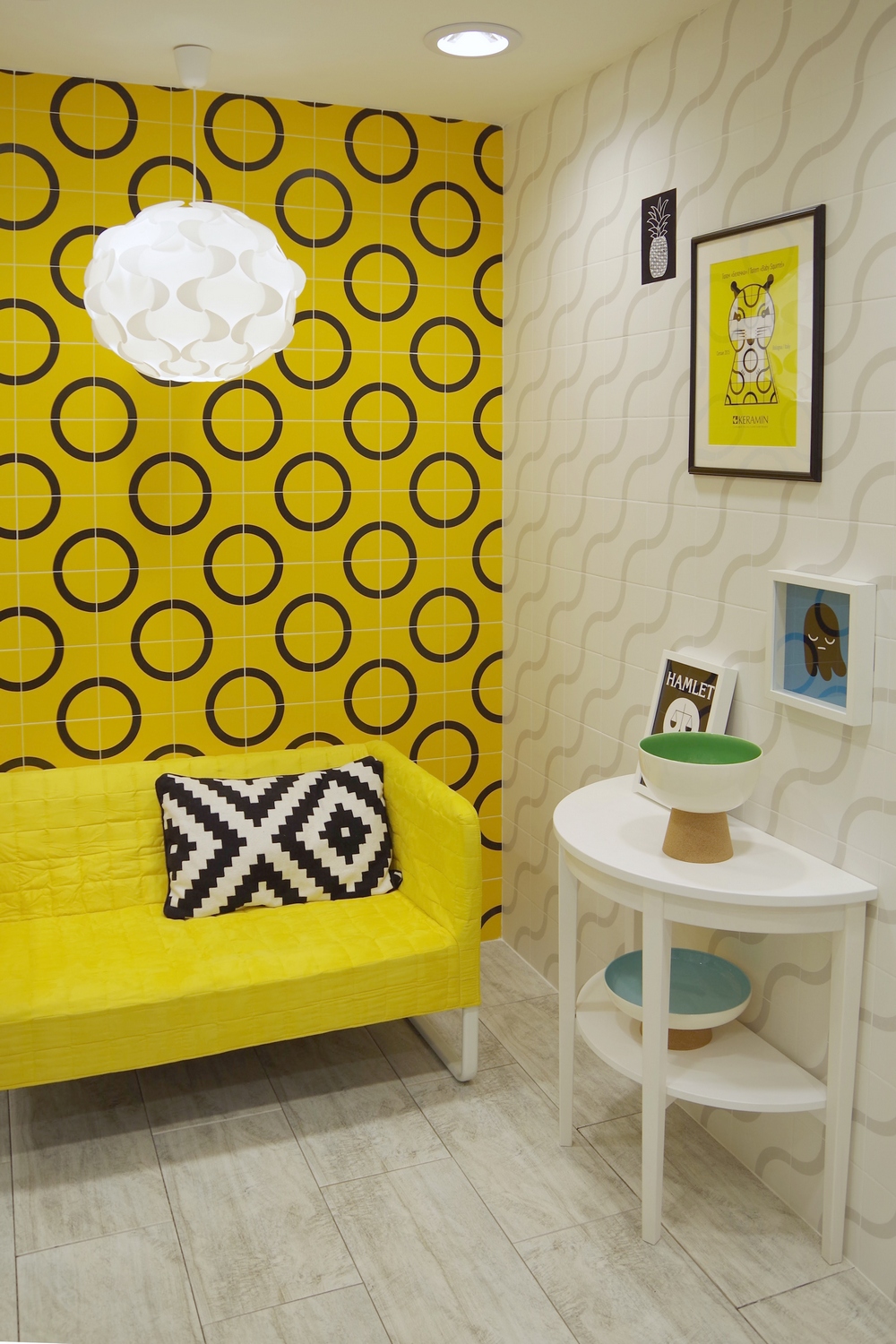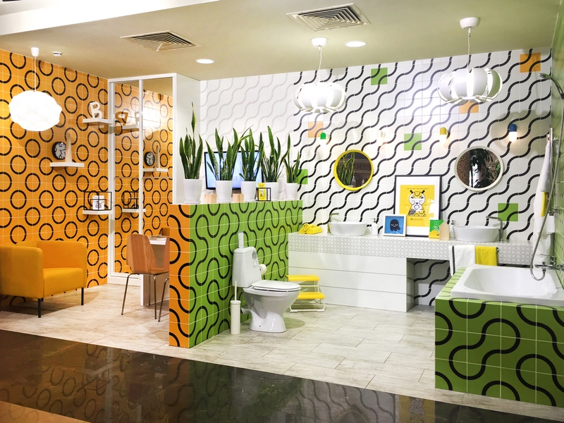 Fans of bright and uninspiring interiors options that are present in this line will appeal to.All products are presented in a single size of 20 × 20 cm. Small squares reinforce the impression of avant-garde and unusual finishes. The basic white tile is covered with black geometric patterns that can be folded into a picture that looks like a maze, waves or circles. For the placement of accents are encouraged to use a range of rich green, yellow and bright blue shades. You can decorate the walls with white tiles interspersed with bright colors or select a separate wall as an accent with the help of contrasting finishes.