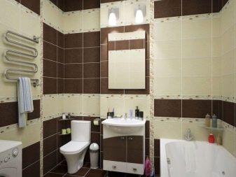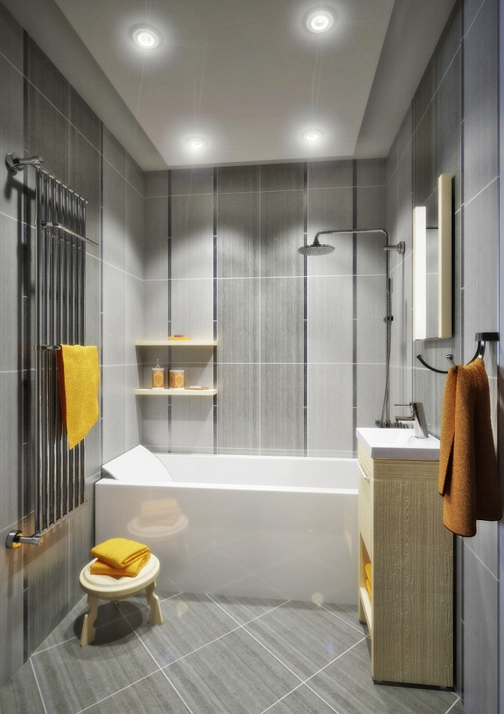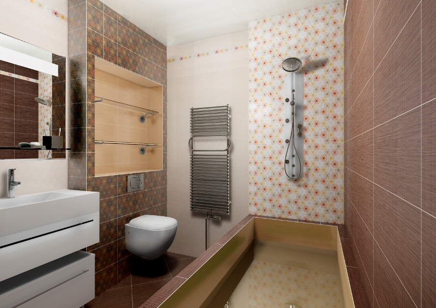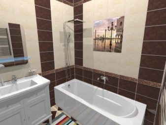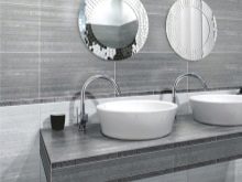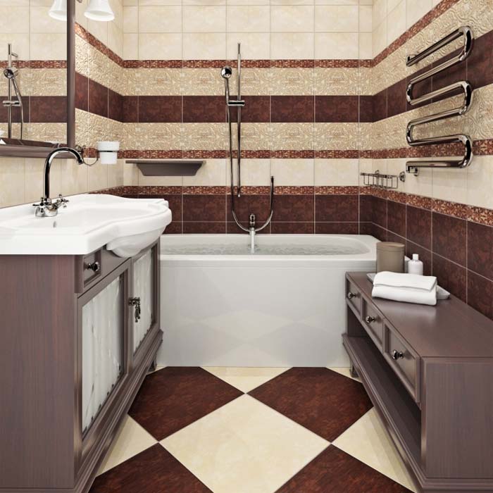 The rectangular elongated tiles of 60 × 30 cm can be used both horizontally and vertically. The lack of shine and imitation of natural travertine, give a noble and restrained look to your bathroom. As a decor, inserts with small elongated dark quadrangles and narrow shaped parts, which can be used to identify separate finishing areas, are proposed. Quite minimalistic design is in demand in small baths and toilets of urban high-rise buildings.