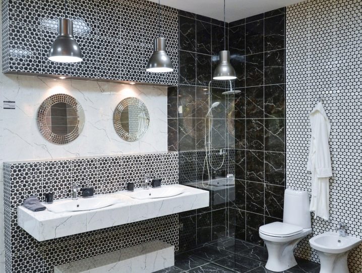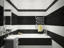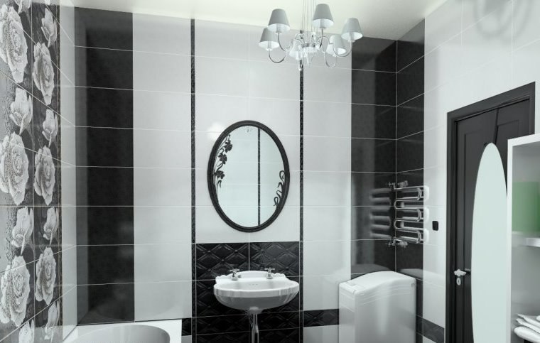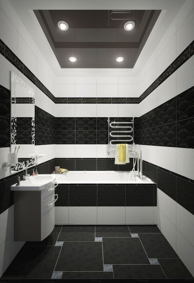 A bath with such a finish can be made in the noir style - expensive, spectacular and very fashionable. Convenient to the presence of white wall base tiles. Thus, the decor can also be used for a small bath in which an abundance of black color would visually reduce the space.