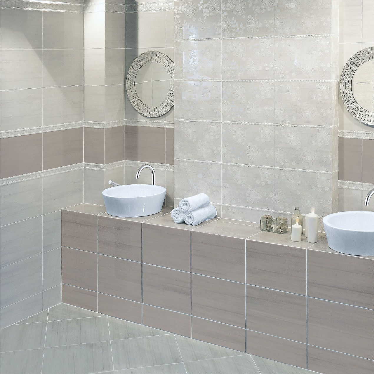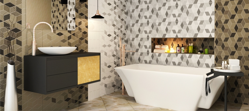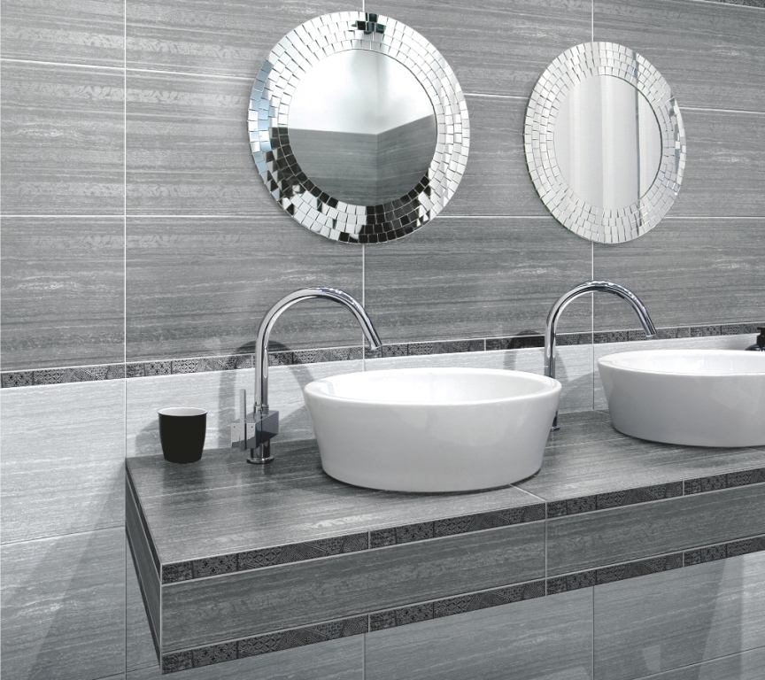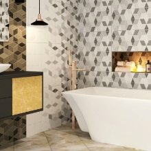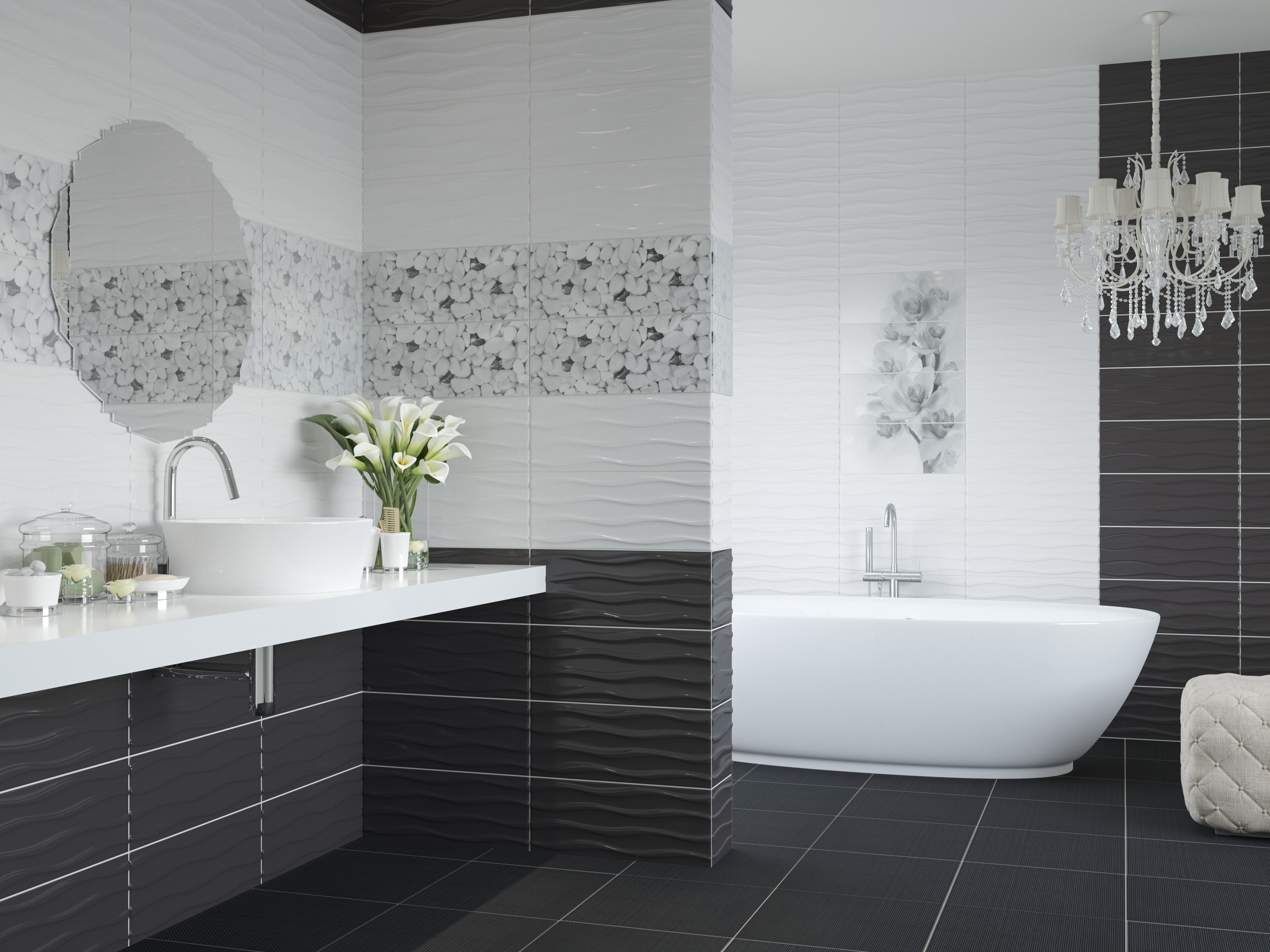 In this line it is impossible not to fall in love. Graphite palette of gray shades draws you to the era of black and white cinema. Tiles of rectangular size 40 × 27.5 cm can be placed in any direction. The panel with the image of roses will create a retro-photo effect, and the tiles decorated under the relief of the skin will add luxury and chic to the interior. A frieze with a golden-gold monogram design will add to the finish of aristocracy.