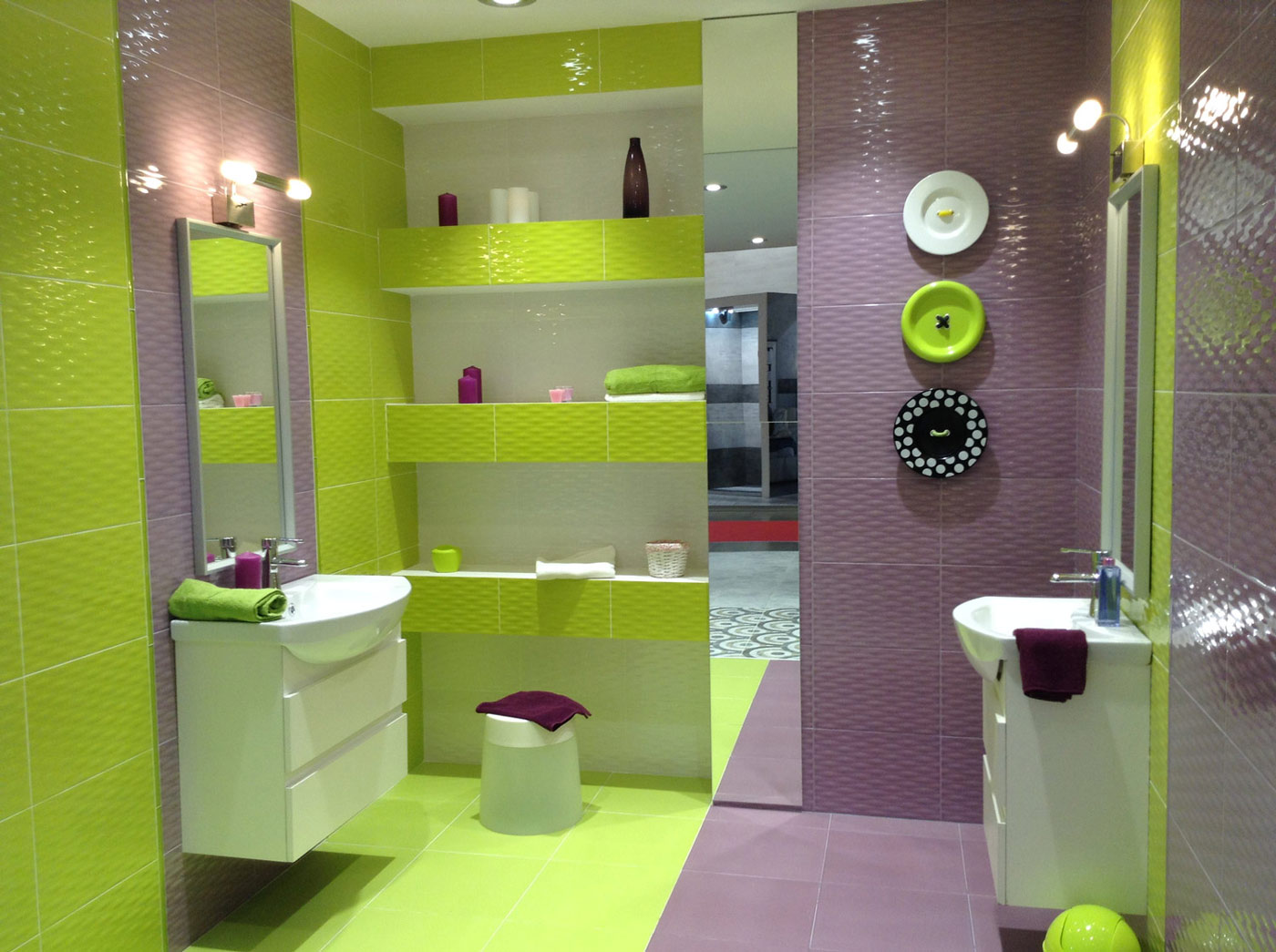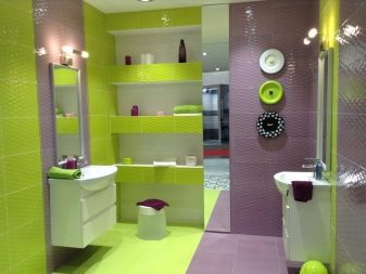 For extraordinary and bright personalities, a combination of bright pistachio and violet in the bathroom interior can be a relevant and unexpected decision. White insert soothes and balances the overall picture.