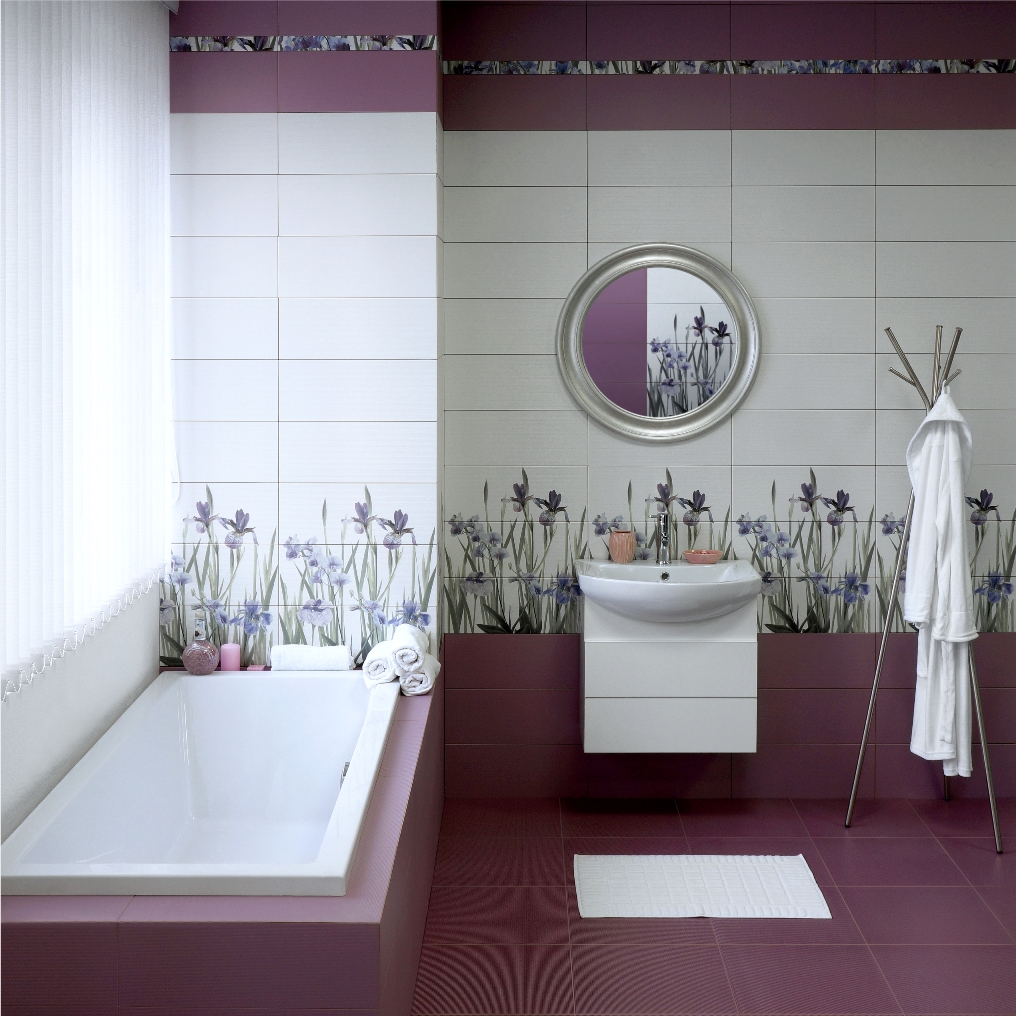 Romantic natures, girls, women can find for themselves an interesting and fresh solution for finishing the bathroom by choosing this collection. Delicate white and lilac gamut of the base with the image of elegant and beautiful irises will bring lightness, spring freshness and harmony to your life. The panel with flowers is presented in two versions as a base and one for the upper edge of the picture. There are also dragonfly tiles.