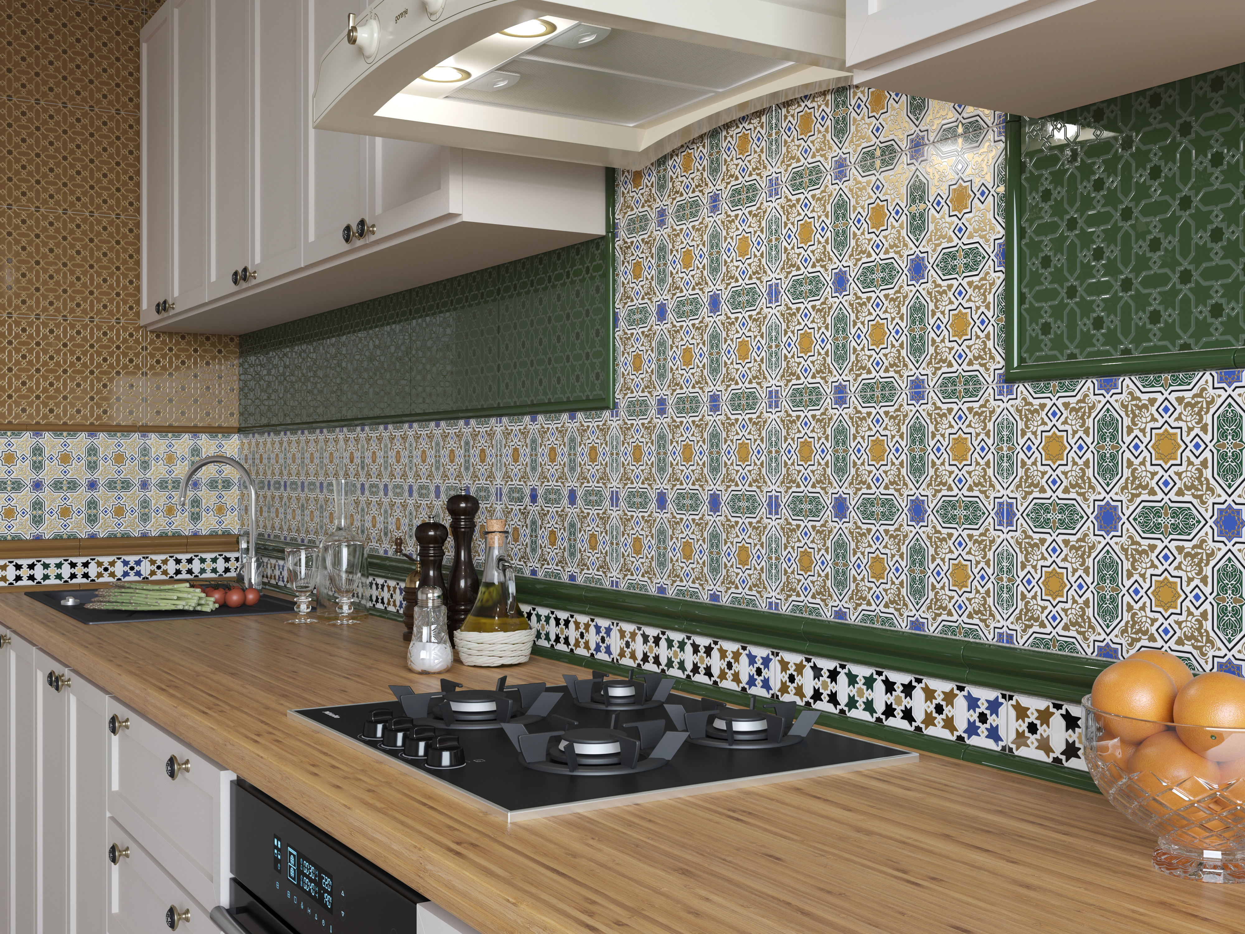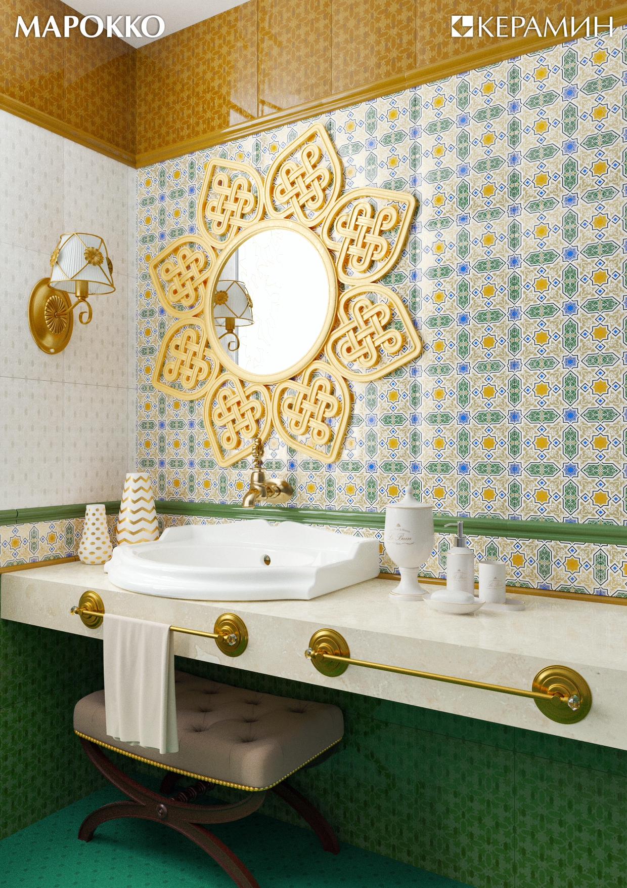 Three different decors, presented by panels and friezes, allow you to decorate the basic decoration with a quaint Moroccan pattern. Tiles for walls and floors have a dull oriental pattern.