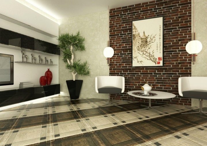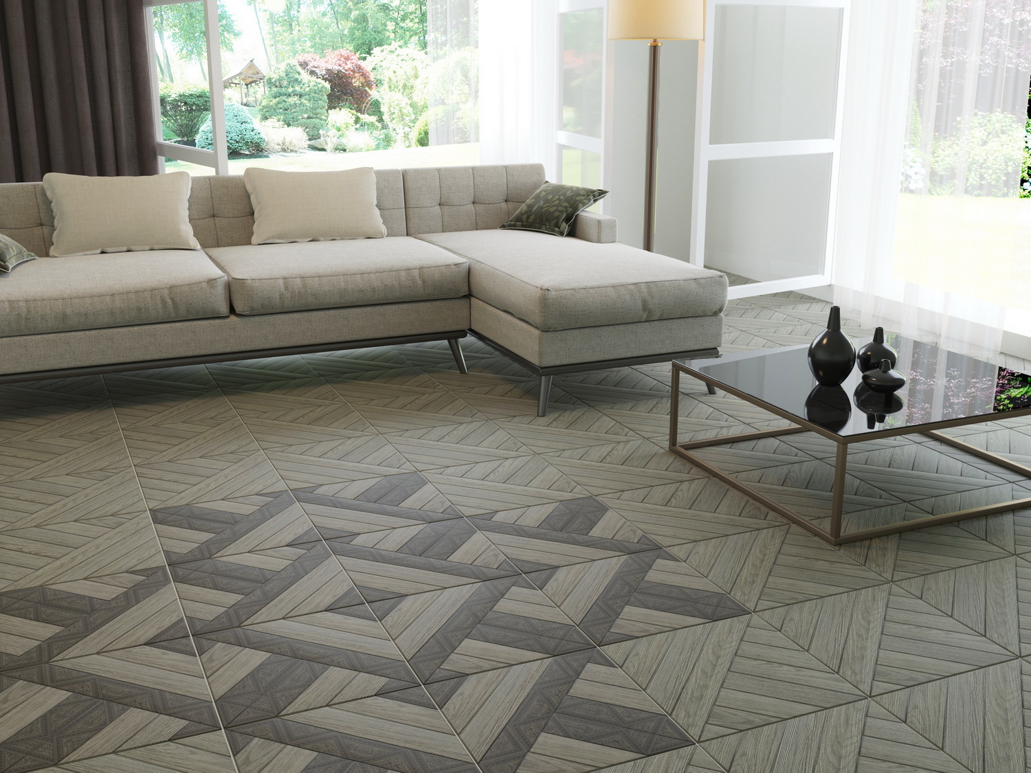 Products of standard sizes are proposed to be placed in the vertical direction. The collection contains four options for floor tiles 40 × 40 cm, from which you can also lay out the pattern in any order, including chess.