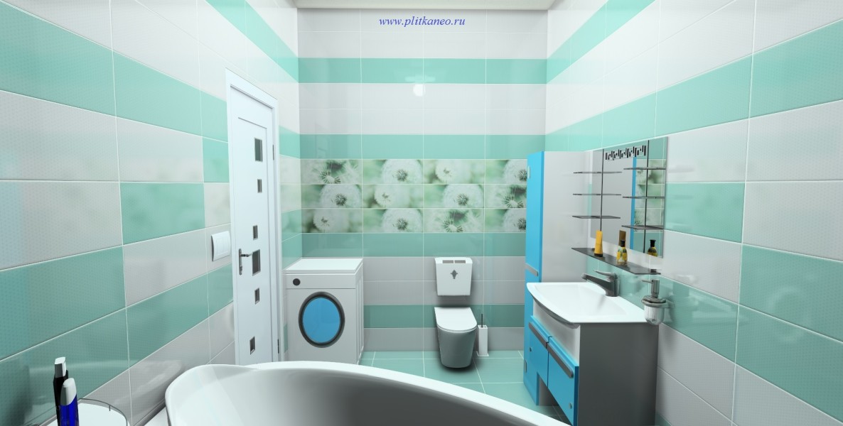 The effect of freshness, sea breeze and airiness is created with the help of a mint shade of the tile and floral themes of the decor. The picture is completed with turquoise furniture.
