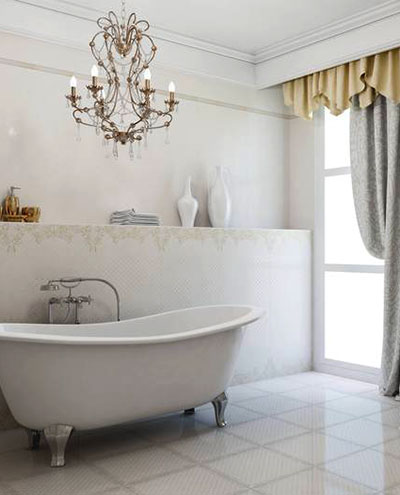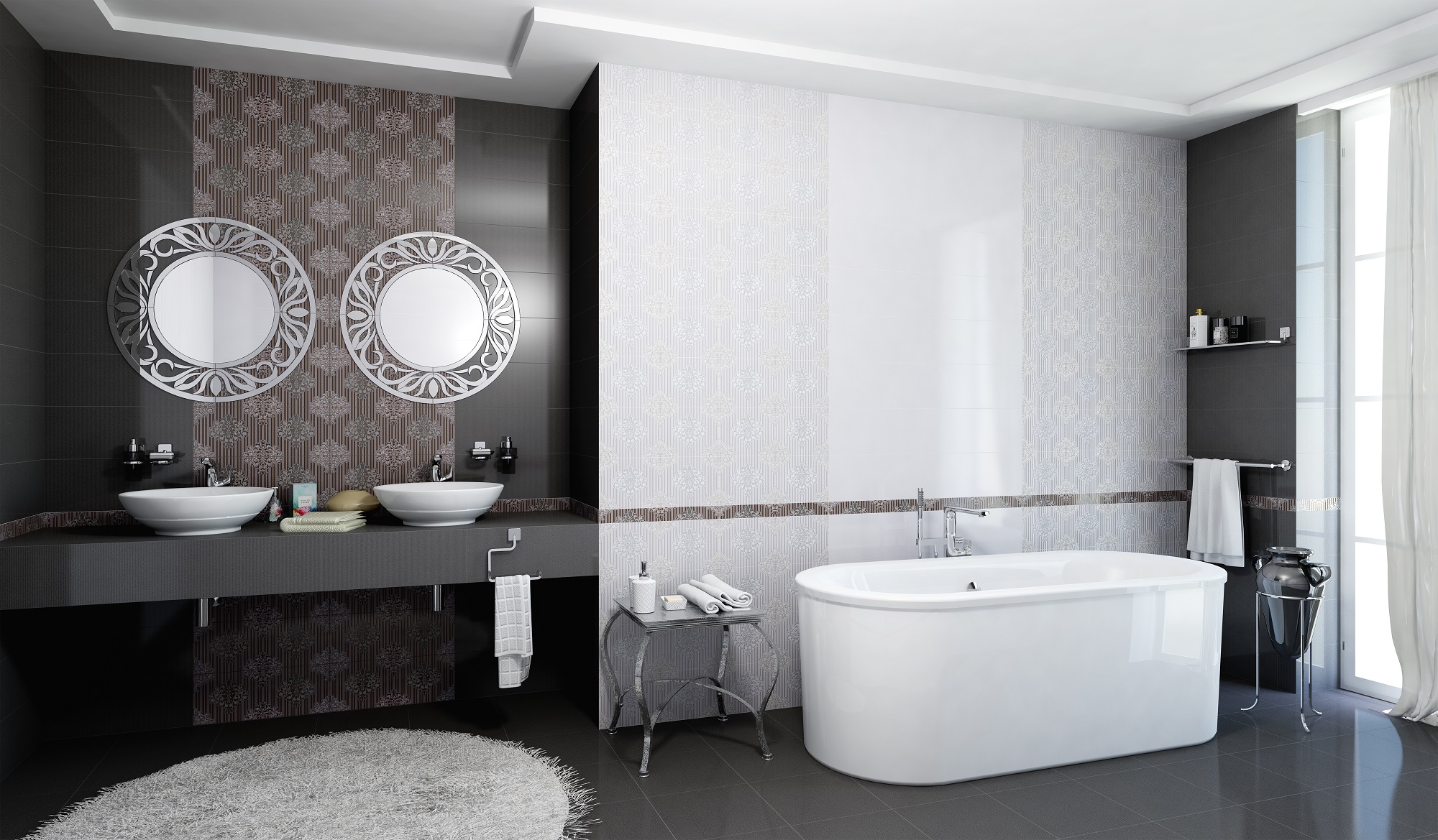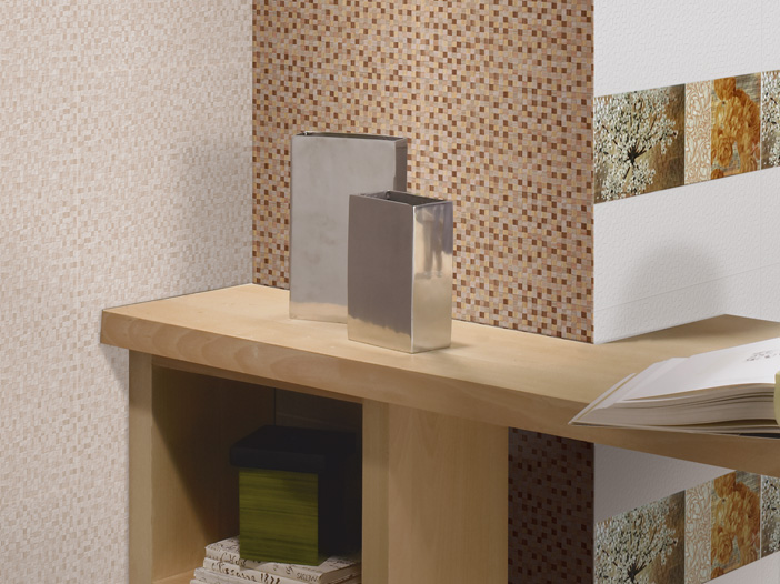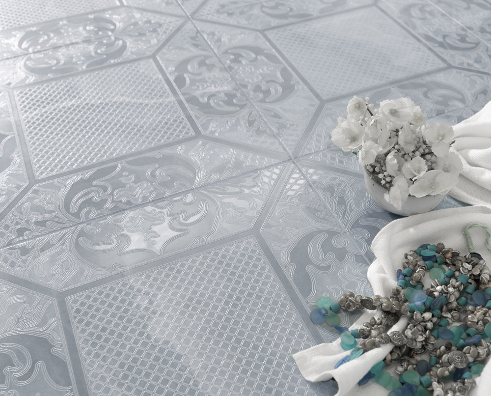 The collection consists of a background tile for decoration of walls and floor, as well as a set of decorative elements that are presented with both a matte and glossy surface.