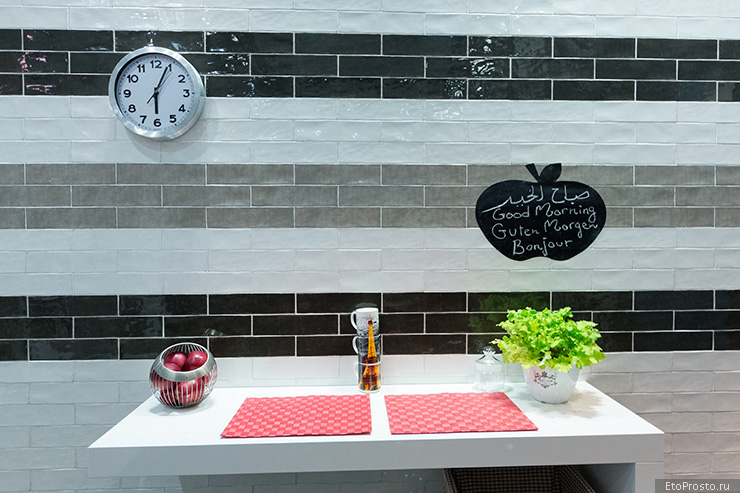 - The use of white tile in the interior looks bright and festive. This color is good for Scandinavian and traditional styles. From it blows purity and comfort.White color makes the room light and voluminous.