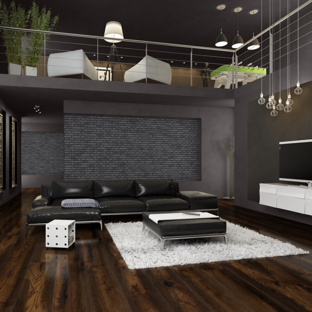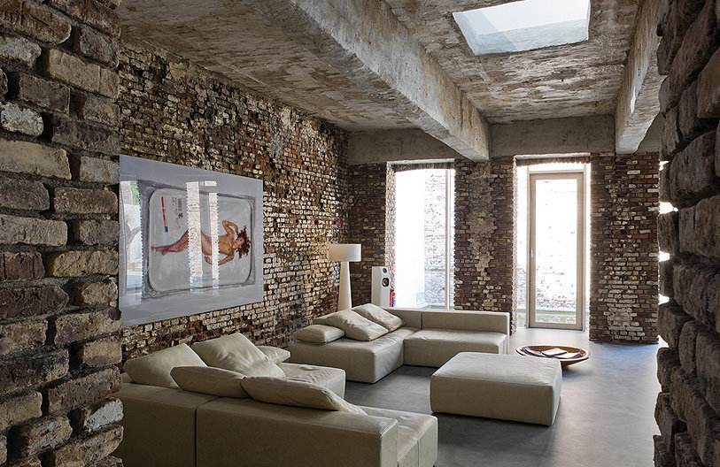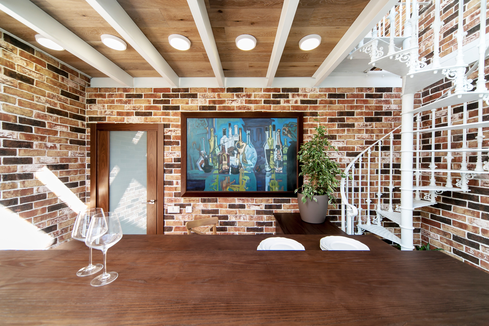 - Spacious room with aged natural red brickwork. Maintains the tone of the floor and enters into complete harmony with the space.