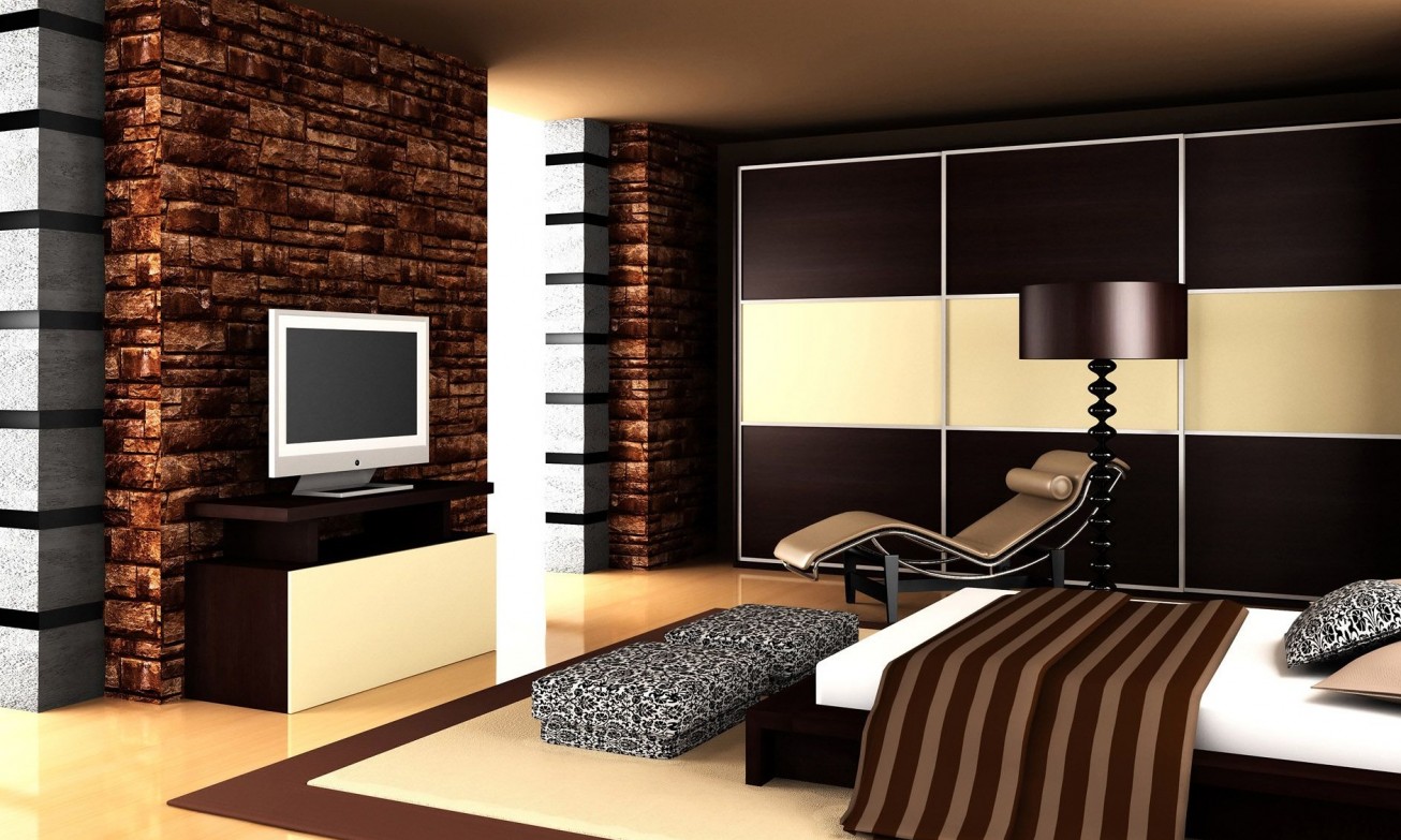 - Modern urban high-tech style using the latest technologies and building materials. Elegantly decorated bedroom with different shades of brown. Decorating the wall with a clinker plate blends seamlessly into the interior.