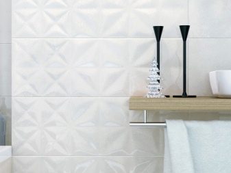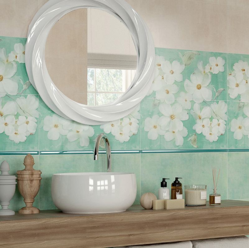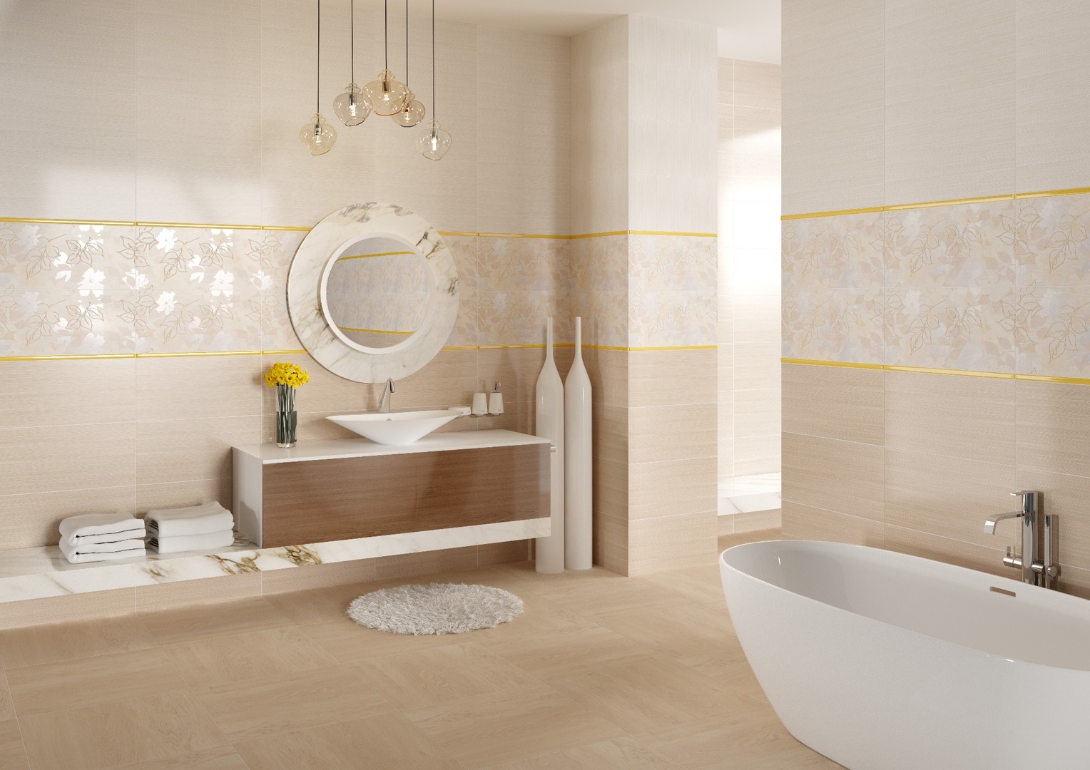 - Glamor tiles Lara presented in sand, white and black colors, can be laid using ornamented border or mosaic inserts in the form of geometric shapes, plants and flowers.