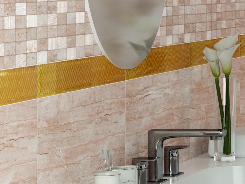 - Collection Delikat distinguish all shades of warm, beige tones. Ceramic granite is made in the style of travertine and stacked mosaic. The golden border of glass fits harmoniously into the overall look.